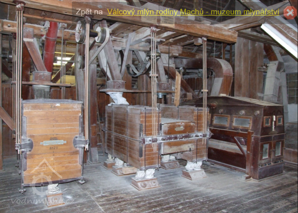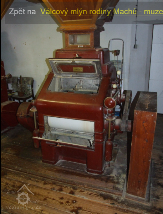 Mlýn z 19. století vlastní rodina Machů od roku 1914. V roce 1942 nechal Josef Machů mlýn rozšířit, strojní zařízení doplnil o plynosací motor. Roku 1951 byl válcový mlýn zařazen do hospodářského družstva, později byl provoz zastaven. V roce 1991 syn posledního majitele provoz mlýna obnovil a zpracovává v něm obilí na všechny druhy mouky. V přízemí třípatrové budovy jsou hnací stroje, transmisní rozvod, násypky dopravníků a kartáčovačka. V prvním patře je loupačka, mlecí stolice, váha a pytlování. Ve druhém patře jsou sila, čistička, vysévače, reforma a prachové filtry. V posledním patře je podstřešní transmisní pohon a hnací zařízení zrnových výtahů. Fasáda mlýna má cihlovou barvu.