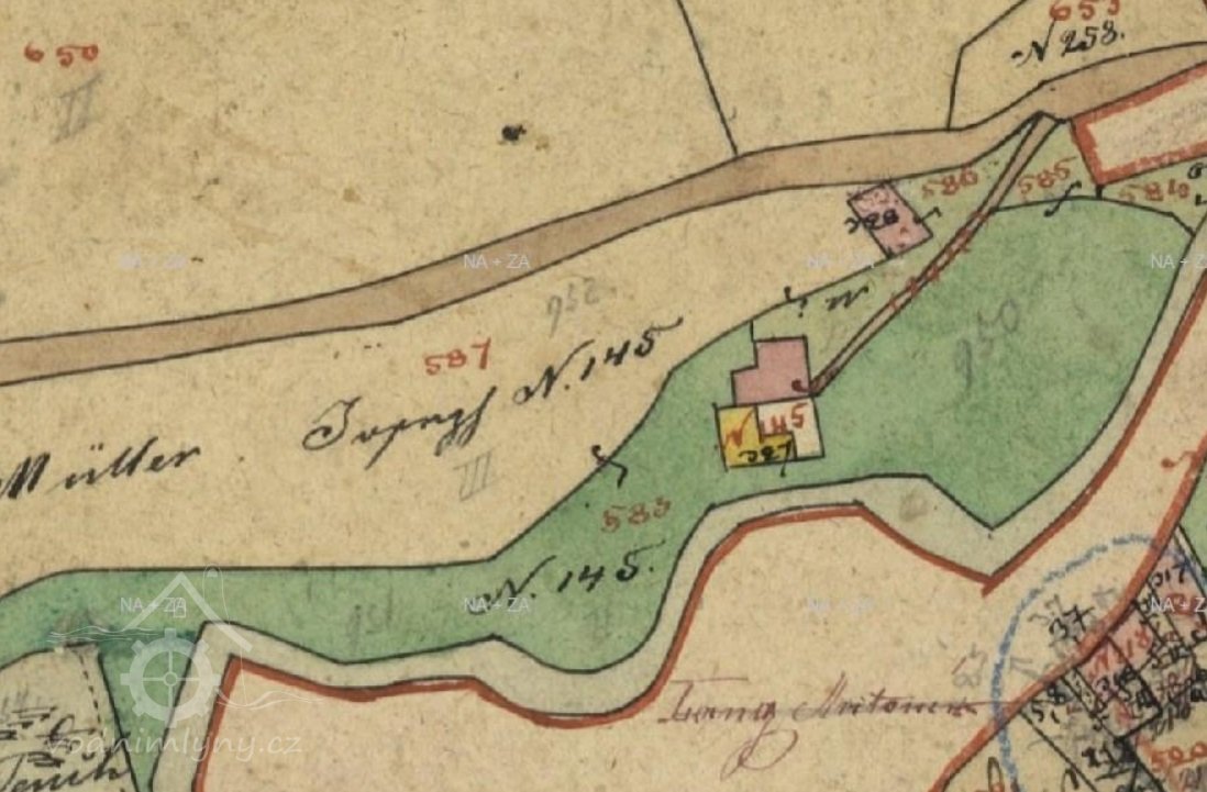 PopisV roce 1930 měl mlýn jedno kolo na svrchní vodu, průtok 0.08 m3/s, spád 6 m, výkon 4.4 HP.