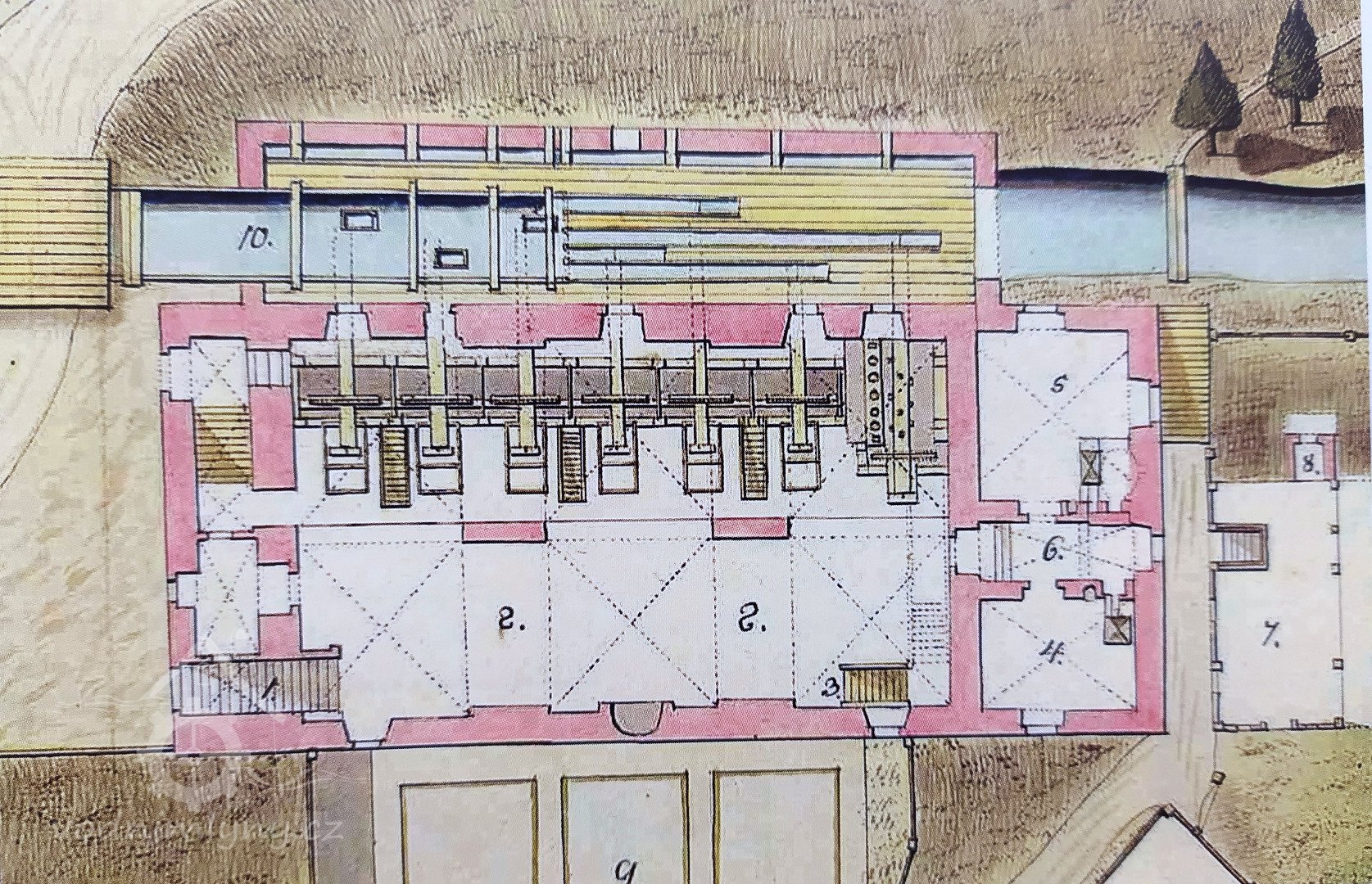 (1.) patro mlýna (podélně rozdělené na obytnou a výrobní část), 22. 9. 1960, © Státní projektový ústav pro výstavbu měst a vesnic (SPÚVMV) v Č.B. (1960): číslo zakázky 00650 (zpra