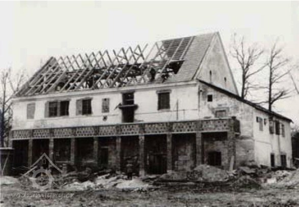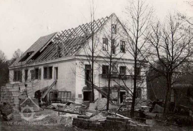 mlýn z jihozápadu při přestavbě, 1960-62, © Karel Skopal st., z publikace R. Novákové "Opatovický mlýn na Zlaté stoce u Třeboně"