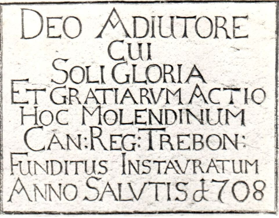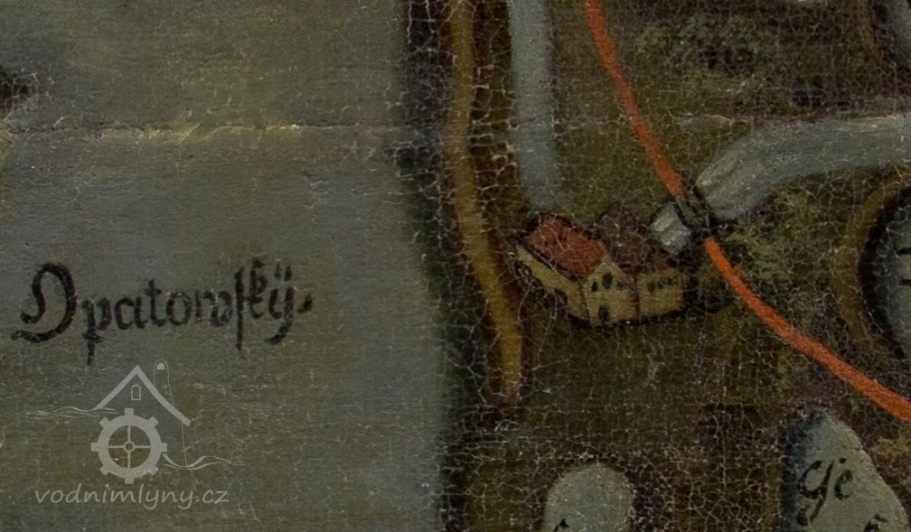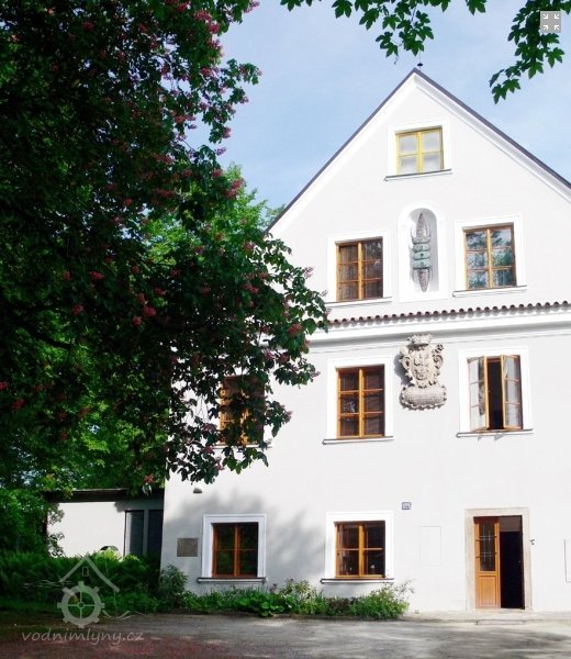 Průčelí mlýna se zakládacím nápisem z roku 1727, 1999, © Jaroslav Kopecký, (Prvky na obrázku: epigrafické památky (nápisy, datování aj.), umělecké prvky (sochy, malby, reliéfy), kamenické prvky barokní a mladší)