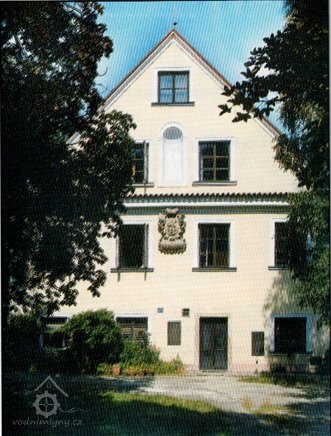podkroví před přestavbou; mezi okny černý čtvereček: uchycení sochy Floriánka umístěné ve výklenku v průčelí, 1960-62, © Karel Skopal st., z publikace R. Novákové "Opatovický mlýn na Zlaté stoce u Třeboně"