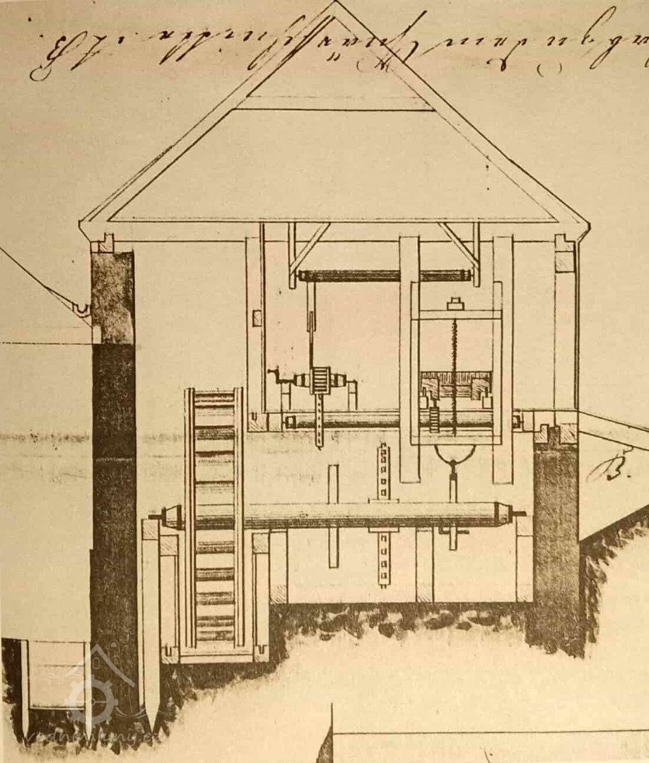 Stavební plán pily, svislý řez. Posun (uprostřed) je opatřen klikou k vracení vozíku., 1862, © SOkA Jindřichův Hradec, fond OÚ Třeboň, kart. 152