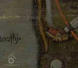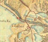 výřez z mapy - nejstarší zachované vyobrazení objektu Op. mlýna, 1684, © Mapa třeboňského panství z r. 1684 (se dvěma pohledy na Třeboň - od východu a západu); renovováno 18