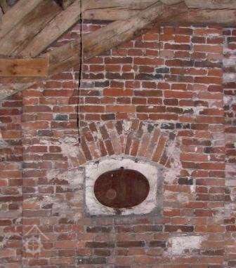 Při přestavbě objevená starší okno a větrací otvory v severním štítě mlýna, 2015, © Ondřej Prášil, (Prvky na obrázku: okno, plastická omítková výzdoba fasád a štítů)