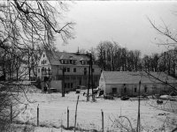 hospodářská část opat.dvora: plotem a částečně i zdí (s vraty) ohraničený dvůr, vpravo stáje, vlevo stodola, 1960-62, © Karel Skopal st., z publikace R. Novákové "Opatovický mlýn na Zlaté stoce u Třeboně"