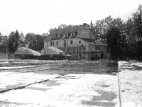 podkroví před přestavbou; mezi okny černý čtvereček: uchycení sochy Floriánka umístěné ve výklenku v průčelí, 1960-62, Karel Skopal st., z publikace R. Novákové "Opatovický mlýn na Zlaté stoce u Třeboně"