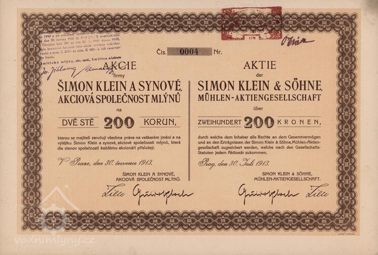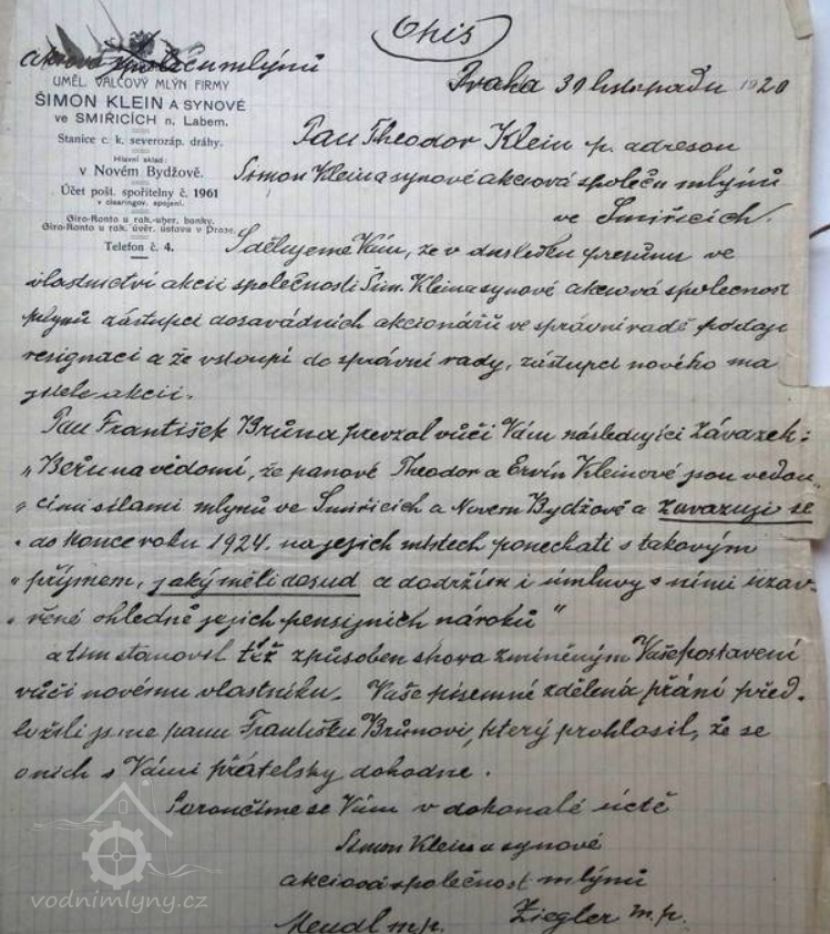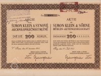 Firma Šimon Klein přeměnila se později v akciovou společnost, jejíž akcie v r. 1920 až na nepatrné množství zakoupil p.Fr.Brůna, velkoprůmyslník v Plavech s příbuzenstvem. Tato akciová společnost přese všechnu krizi, která nastala v oboru mlynářském v době poválečné, přinesla velikých obětí na rozšíření a zmodernizování závodu. V dnešní době má též nově postavený úplně automatický mlýn žitný s nejmodernějšími stroji o výkonnosti 20 000 kg ve 24 hodinách. Mlýn pšeničný zařízen je na výkonnost 50 000 kg ve 24 hod. Pro neustálené poměry jest z větší části provoz mlýna obmezen z důvodů těch zaměstnává průměrně 35 dělníků a 10 – 12 úředníků a výrobky jeho zasílaly se v době konjunktury po celé oblasti republiky a i do sousedního pohraničí.