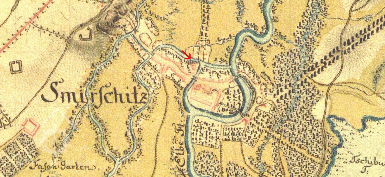 Od toho mlejna ten díl Labe teče novejmi struhami přes grunty jeho milosti Páně a zase vpadá do Labe do toku svého starého nad Lochenicemi, jest dýlky od toho mlejna až do Labe 120 provazců (1 provazec = dnešních 31 metrů), v kterejžto struhách nemálo ryb říčních všelijakých, též také rakův jest, a toho se všeho lapáním k potřebě zámku užívá…“