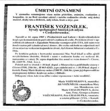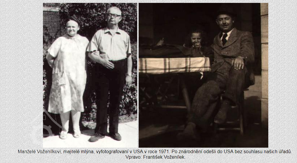 Další osudy mlýna ještě zcela nevymizely s paměti našich starších spoluobčanů. Ti pamatují, že od 1. srpna 1930 vlastnila Smiřické mlýny rodina Voženílkova. Jistě jsou mezi námi ti, kteří tuto rodinu znali i osobně. Ti pochopitelně pamatují, že mlýn byl znárodněn a rodina Voženílkových emigrovala na západ. Snad vás bude zajímat, že starý pán – pan František Voženílek – zemřel před 12 lety ve věku 80 let v USA: