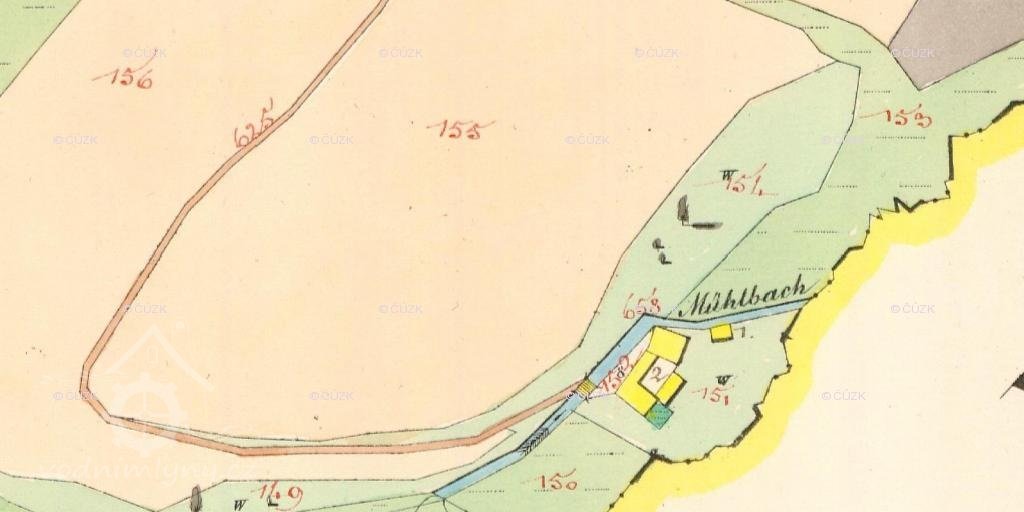 PopisV roce 1930 mlýn pohání kolo na svrchní vodu s průtokem 95 l/s, spádem 4.5 m o výkonu 3.56 HP.