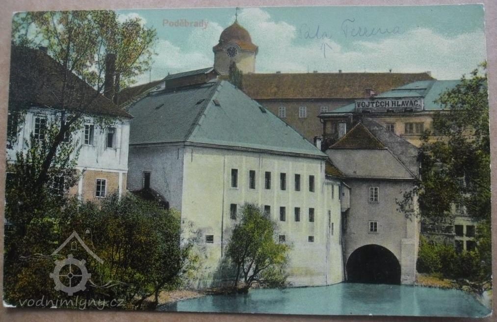 Poděbradský mlýn se nacházel v těsném sousedství zdejšího panského sídla při pravém břehu Labe, přičemž byl vysunut do koryta řeky k jezu. V této poloze je mlýn doložen již ve 13. století. Svého času měl být největším mlýnem na našem území. Původní mlýnské stavení bylo dřevěné. Od počátku 17. století byl mlýn pronajímán soukromým osobám. Do té doby náležel k panskému hospodářství. V roce 1816 nastoupil do mlýna Vojtěch Hlaváč, první z řady zdejších mlynářů toho jména. Jeho syn, také Vojtěch, stál v 60. letech 19. století za velkorysou přestavbou mlýna, jehož součástí byl nový velký parní mlýn s pohonem turbiny. V sousedství mlýnského provozu byl zároveň přistavěn velký dvoupatrový obytný dům. V následujících letech na mlýně hospodařili další Hlaváčové, kteří jej však zatížili značnými dluhy. V souvislosti s novodobou regulací Labe vykoupil mlýn rakouský erár, který jej posléze prodal společnosti s ručením obmezeným Společné mlýny a pekárny v Poděbradech založené v roce 1917. V té době se mlýn znovu modernizoval a byl elektrifikován. Další činnost přerušil mohutný požár, který roku 1933 zachvátil celou mlýnici včetně všeho příslušenství. Zachovala se pouze obytná část. Ani ta však nakonec neunikla zkáze. V 50. až 70. letech 20. století byl postupně zbytek mlýna i s vodním dílem zlikvidován. Někdejší podobu mlýna tak dnes již dokládají pouze dobové ikonografické materiály.
