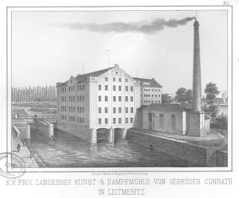 Mlýn postavil v letech 1852–1853 August Conrath (1814–1871) se svými bratry Emanuelem a Josefem, sklářskými podnikateli z Kamenického Šenova. Mlýn měl umělecké složení a již před rokem 1858 také parní pohon – po mlýně v Lovosicícha na Smíchově jako jeden z prvních v Čechách. Dne 7. března 1904 byli dědicové podniku nuceni provoz ukončit a mlýn nabídnut k prodeji – tehdy měl roční kapacitu 6 000 tun a dva parní stroje 50 a 30 HP. Zakoupila jej smíchovská konkurence, firma Ignaz Roubitcek, která provozovala také panský mlýn v Berouně a mlýny v Terezíně, a již po smrti zakladatele Ignaze Roubitcka (1833–1900) vlastnil podílník Max Bloch. Provoz byl záhy obnoven a pokračovali v něm (s přestávkou roku 1923) i dědicové firmy Quido a Konrád Bloch, kteří roku 1933 zadali pražské kanceláři Konstruktiva projekt nové parní kotelny a strojovny. V květnu 1938 se jim převodem na akciovou společnost podařilo mlýny firmy Hynek Roubitcek prodat. Mlýn v Litoměřicích je v provozu dodnes, produkcí 300 tun denně je největším v České republice.