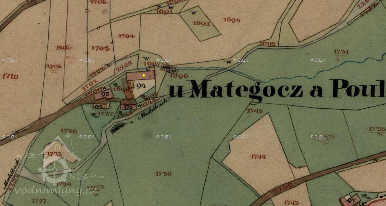PopisV roce 1930 měl mlýn 2 kola na svrchní vodu, průtok 0.085 m3/s, spád 3.8 m, výkon 3 HP