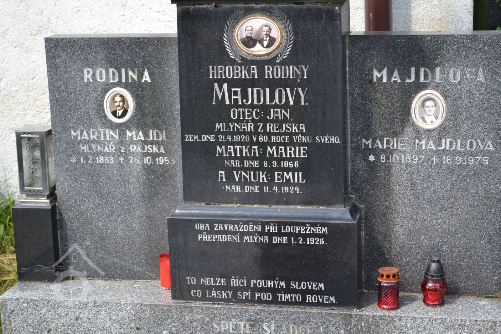 Ve mlýně se odehrála 1. 2. 1925 strašlivá tragédie. Toho dne ráno vyrazil mlynář Martin Majdl se svou ženou Marií a sestrou Terezií na mši do kostela v nedalekém Čachrově, doma zůstala Martinova matka Marie, devítiměsíční syn Terezie Emil a pasáček Jonáš sloužící ve mlýně. Na odchod rodiny v nedalekém lese čekal recidivista Bedřich Krása který se nedávno ve mlýně ucházel o práci ale mlynář ho musel odmítnout neb pro něho žádnou práci neměl, dvacetiletý psychopat se rozhodl pomstít a mlýn vykrást, netušil však že mlýn nezůstal prázdný...