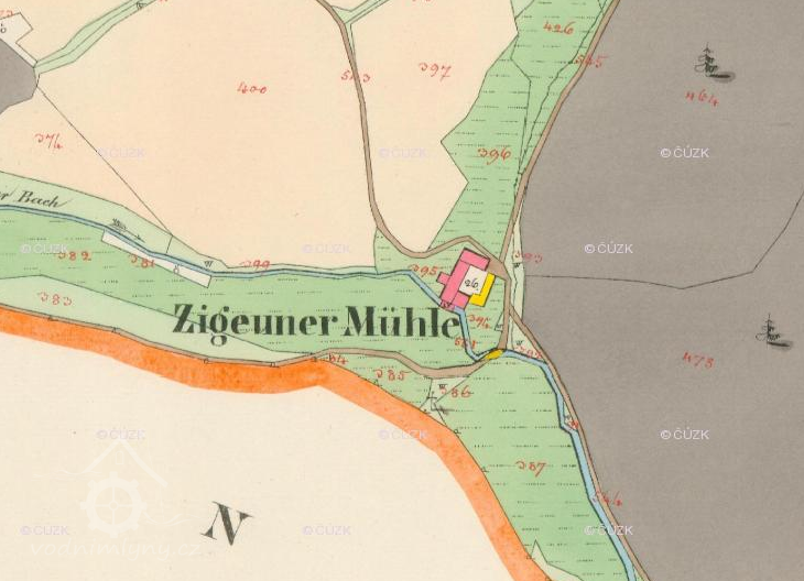 Skupina budov v katastrálním území Šumavské Hoštice,zobrazena na mapě Stabilního katastru :Čechy-7809-1 ,mapový list č.004.Jednalo se o následující objekty:-dům čp.19/st.p.26/1-"obydelní a mlýnské stavení",obytný domek čp.35/st.p.26/2 a domkářskou usedlost čp.39/st.p.26/3.Při zákresu usedlosti do mapy Stabilního katastru/1837/ je ve skice uvedeno jméno tehdejšího vlastníka: " No.19-Winzig/Zigeuner/Albert".K rozdělení stavební parcely č.26 došlo před r.1875. K vlastnictví mlýna: