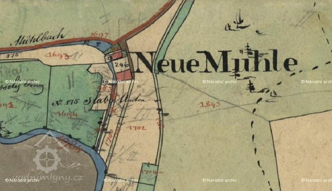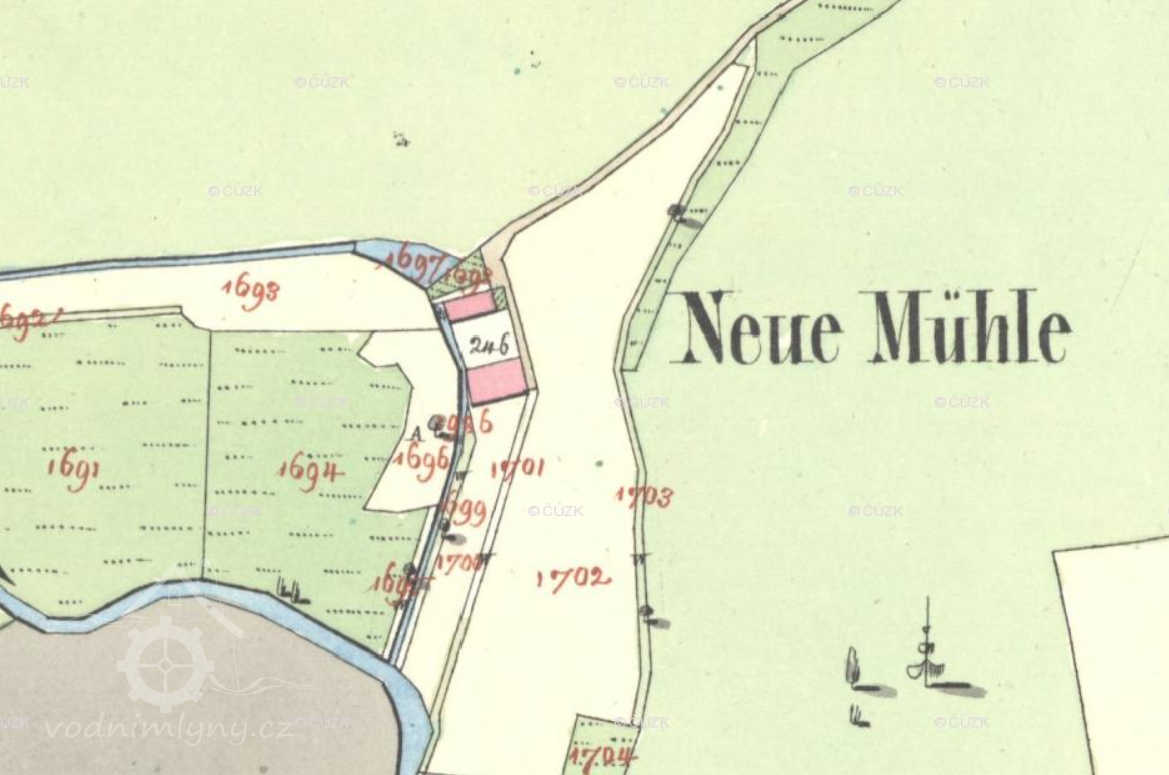 Nový mlýn je v archivních pramenech často veden pod jménem "Nebeský". První doložená písemná zpráva je z r. 1636, kdy jeho majitelkou byla Sybila Polyxena Elznicová, roz. Čejková z Olbramovic.
