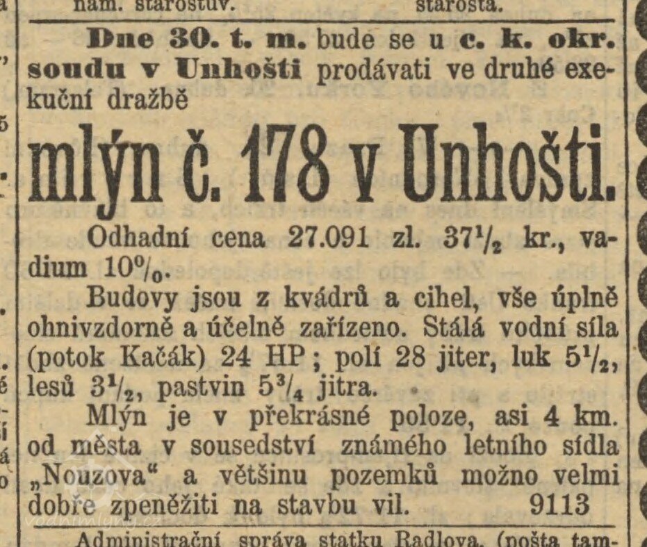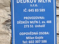 Na adrese Unhošť č.e. 488 (dříve č.p. 178) najdeme Dědkův mlýn, který byl přebudován na výrobnu houslí. Pojmenován je po mlynáři Martinu Dědkovi, jinak také zvaném Suchý mlynář, o kterém se písemné zprávy zmiňují v 1. pol. 18. století. V roce 1840 byl mlynářem Václav Jahoda, v roce 1875 mlýn vlastnili manželé Štíbrovi, roku 1880 Josef a Marie Grunclovi. V roce 1897 byl mlýn prodán v exekuční dražbě s vyvolávací cenou 27 091 zlatých a zakoupil jej Karel Špaček, Grunclovi zůstali jako nájemci. V roce 1904 Grunclovi zakoupili mlýn v Sakách, nový majitel je Václav Štěpánek. V roce 1908 jej vlastní Václav a Kateřina Štěpánkovi. Vedle mlýna byla postavena pila.