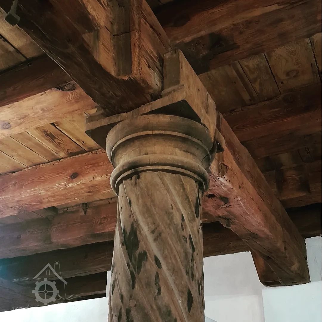 Výstavní síň ve mlýnici, 05 2024, © Ivana Veselá, (Prvky na obrázku: tesařsky zdobené podpůrné sloupy, trámový strop)