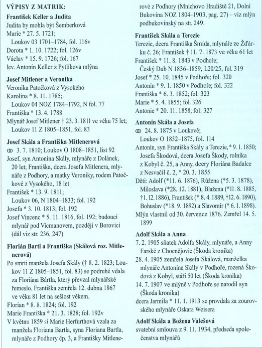 V roce 1843 převzal mlýn v Podhoře syn Josefa Skály František. Za manželku si vzal dceru mlynáře Františka Šmída ze Žďárku čp. 26 Terezii. Měli dceru Annu a syna Antonína (narozen 1850). (MH)