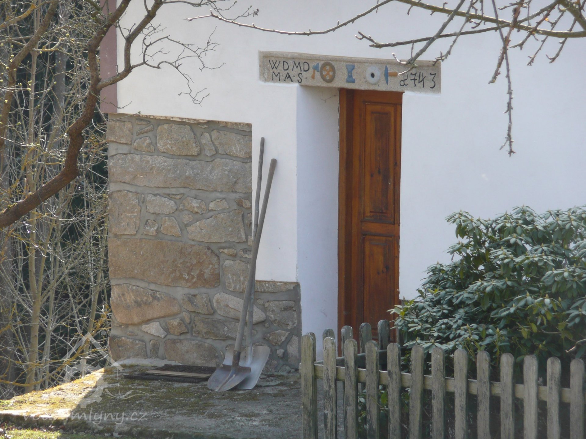 Datace mlýna ve štítě obytné budovy - detail, okna, 2014, © Marie Klenovská, (Prvky na obrázku: okno, epigrafické památky (nápisy, datování aj.), plastická omítková výzdoba fasád a štítů, zdobený zděný štít)