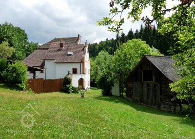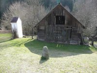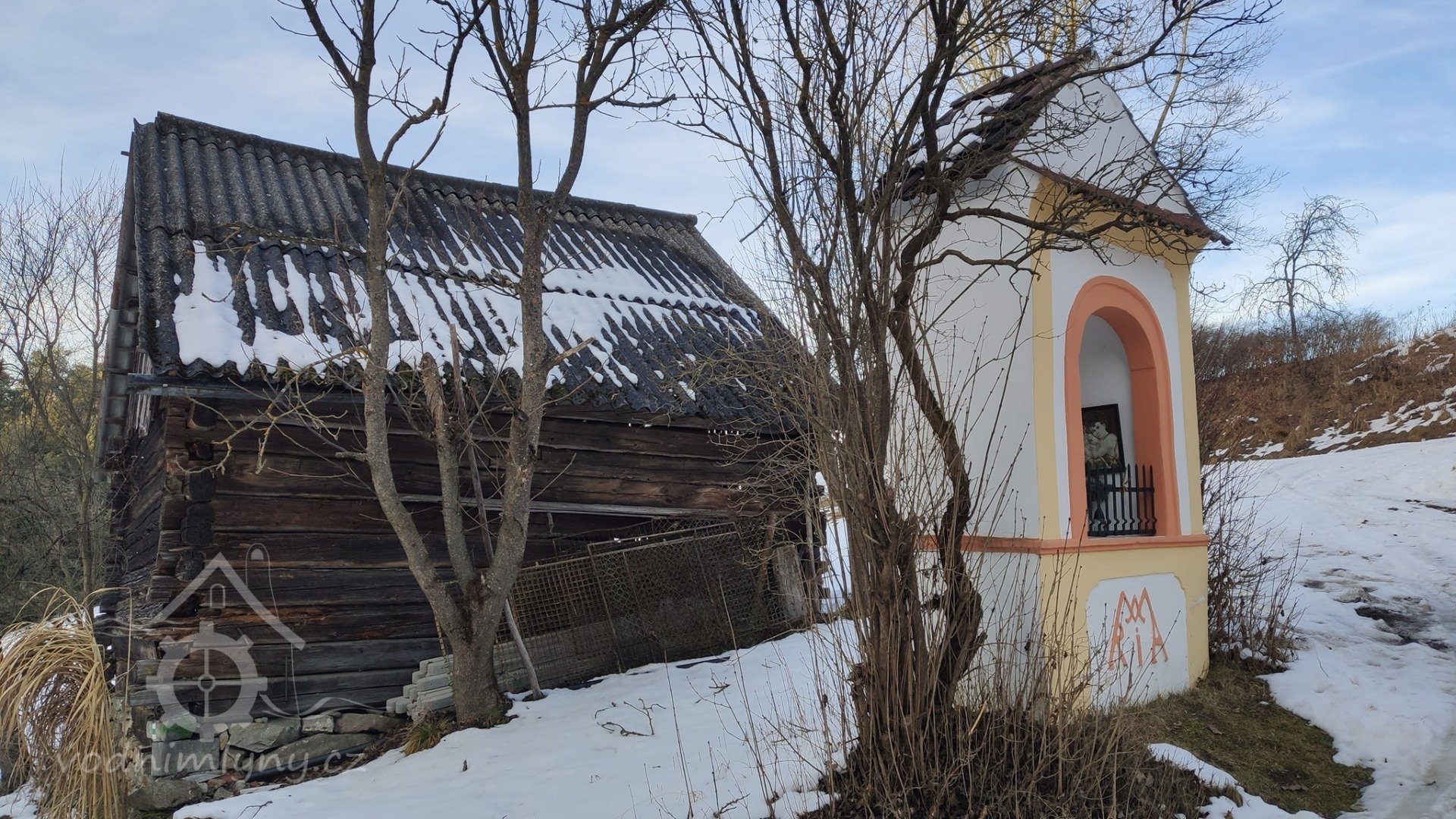 Kaplička těsně u cesty kolem mlýna, udržovaná zřejmě obyvateli mlýna ?, za ní menší roubená stodola, 10/2019, © PK, (Prvky na obrázku: drobné sakrální památky)
