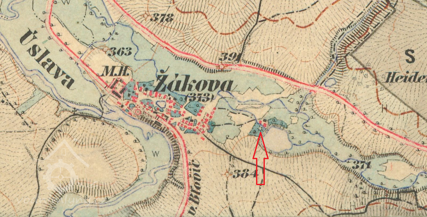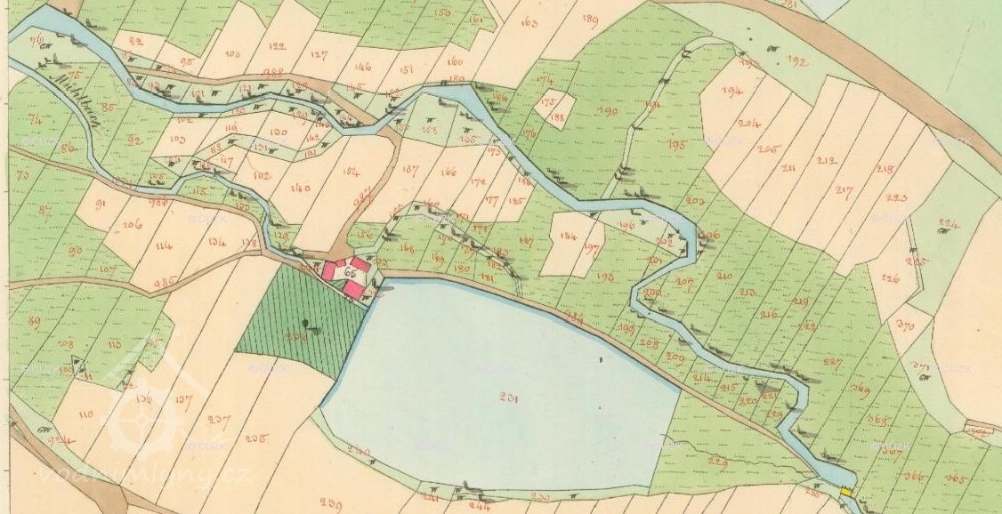Nad mlýnem rybník, z rybníka náhon se stavidlem na vantroky se stavidlem