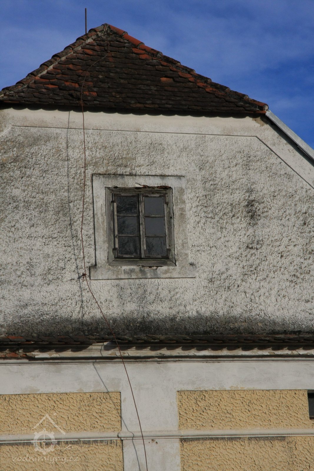 Pohled na mlýn ze dvora, 2014, © Šimek, (Prvky na obrázku: okno, plastická omítková výzdoba fasád a štítů, schodiště)