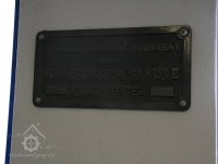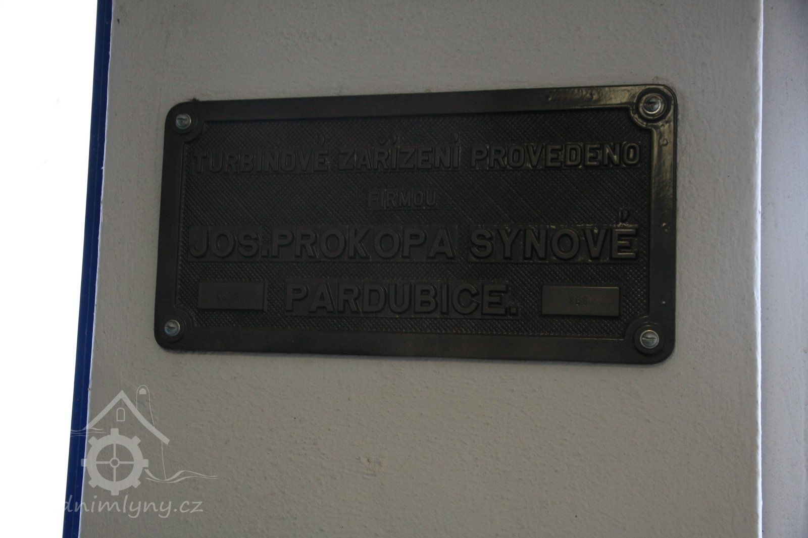 Litinová deska s údaji o turbíně, 2014, © Šimek, (Prvky na obrázku: značka výrobce na vodním motoru)