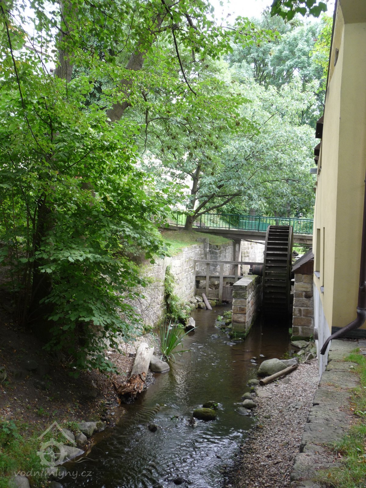 U mlýna je dnes obnovené vodní kolo na spodní vodu.
