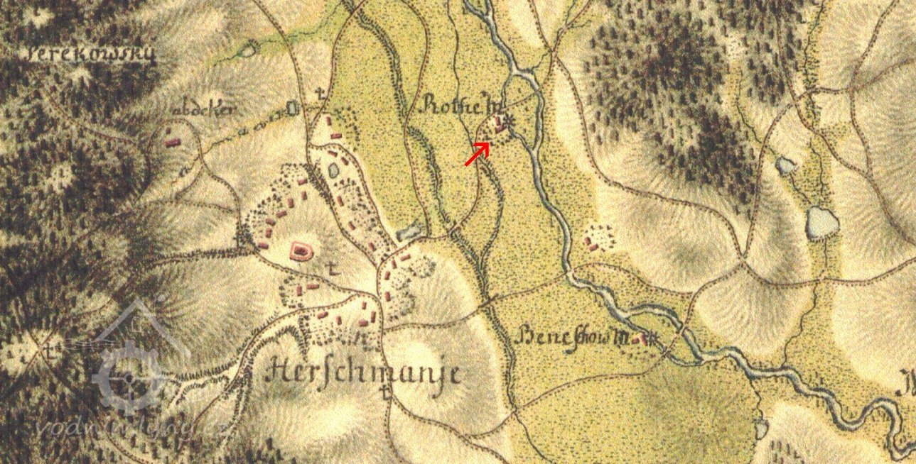 Další, velice starý zápis, je zřejmě z roku 1637, kdy zemřel Don Martin Huerta, který měl v zástavě písecké panství a vypořádával se jeho majetek a dluhy: „... taxa a prošacování statku Božovického se vším a všelijakým od starodávna příslušenstvím a právem - mlejn červený řečený a přiněm volejna pod městysem Heřmaní od kamene z gruntu na vodě ještě cihlami (prejzy) krytý (od toho patrně název červený) na 99 kop 25 grošů a 50 denárů prošacovaný.“