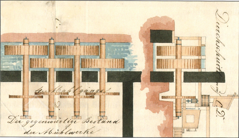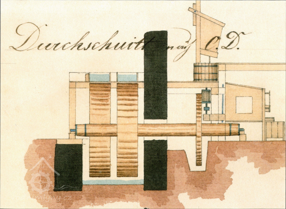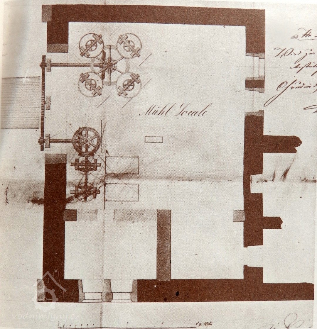 Jedno vodní kolo pohánělo mlýn nebo pilu tak, že na hlavní hřídeli byla dvě paleční kola, a to v podkolích na obou stranách lednice.