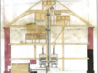 Velké ozubené kolo na svislé transmisi pohánělo na 1. podlaze současně 4 dvojice mlecích kamenů.