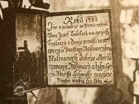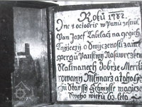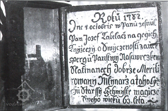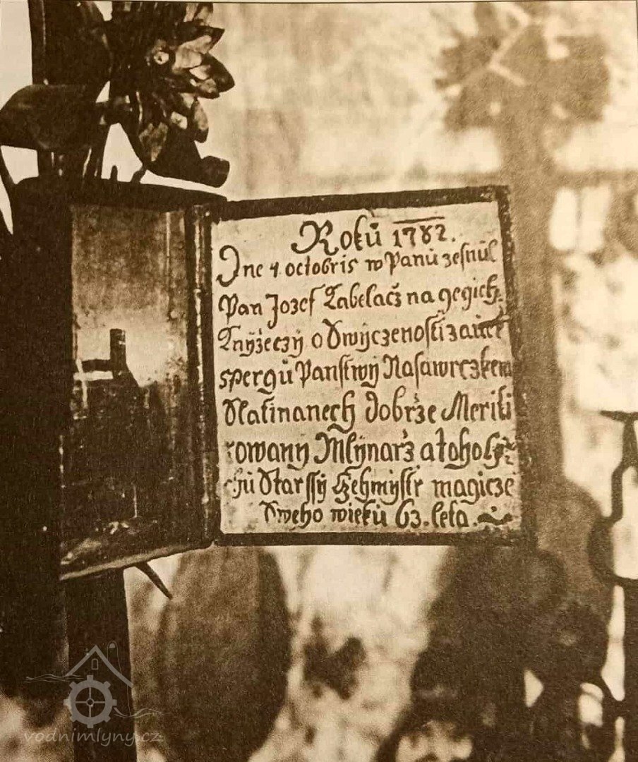 Roku 1782 dne 4. octobris w Panu zesnul Pan Jozef Kabelacz na gegich Knýžeczý oSwycenosti z Auespergu Panstwy Nasawrczkem Slatinanech dobrze Merilirowany Mlynarz a toho Czechu Starssy Czechmystr magicze Sweho wieku 63. leta