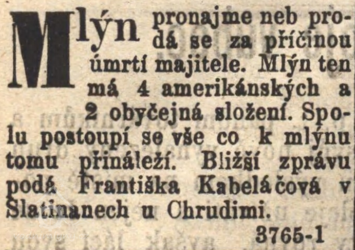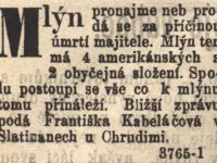 V r. 1867 zemřel mlynář Kabeláč, mlýn byl na prodej. (RR)