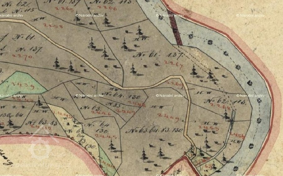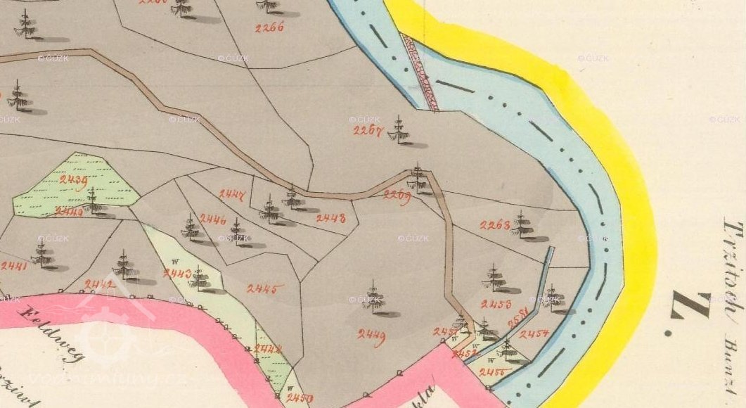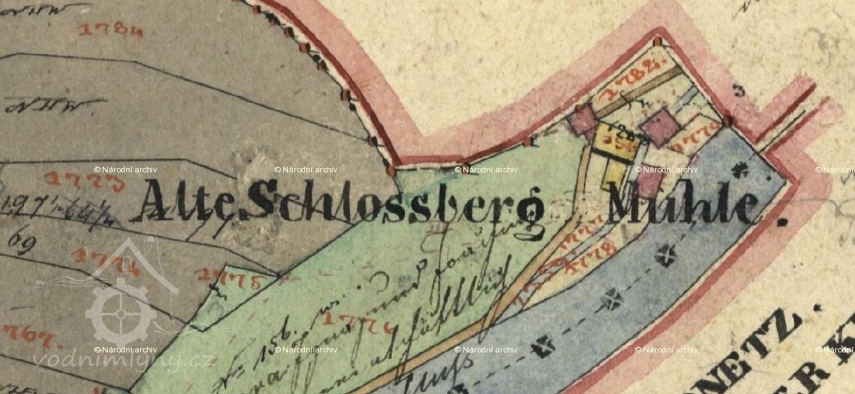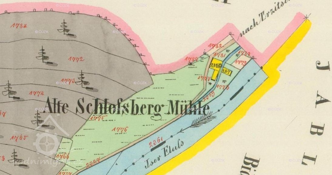 Zaniklý mlýn na náhonu u Jizery, kde si Václav Patočka roku 1775 koupil pozemek ke stavbě mlýnu od hraběte Carretto-Millesimo.