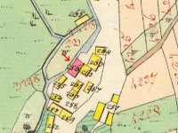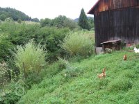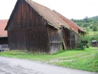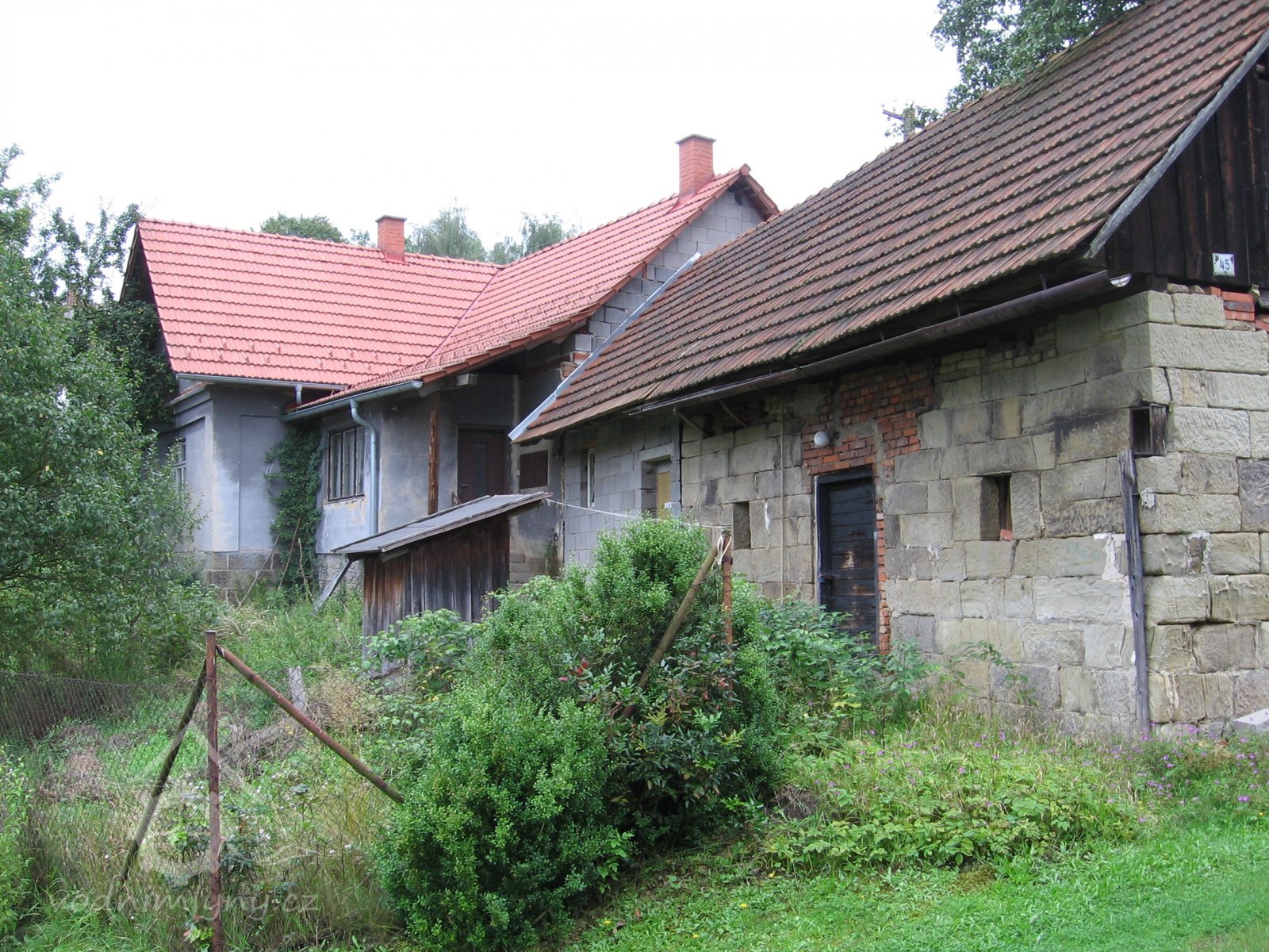 Neobydlené stavení s chátrajícím hospodářskými budovami.