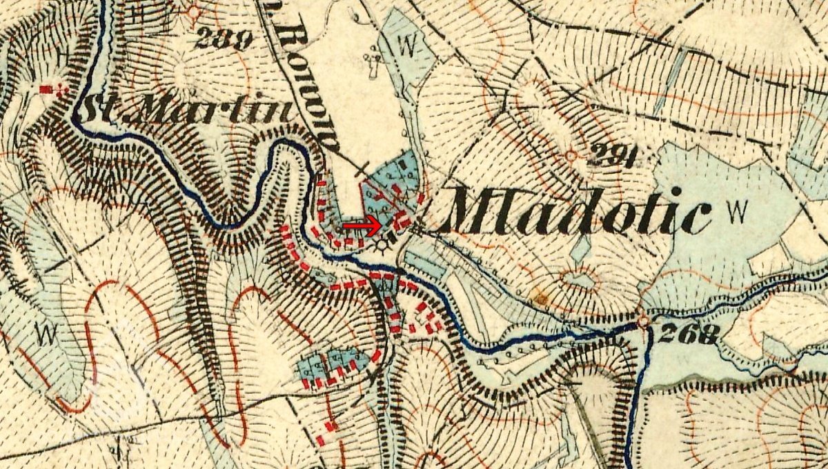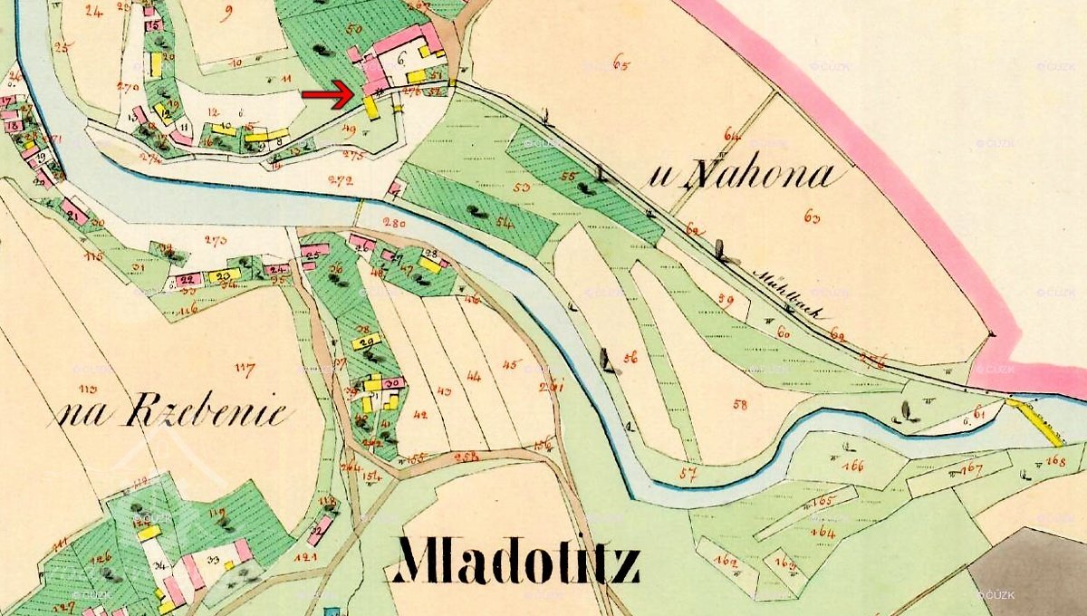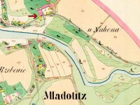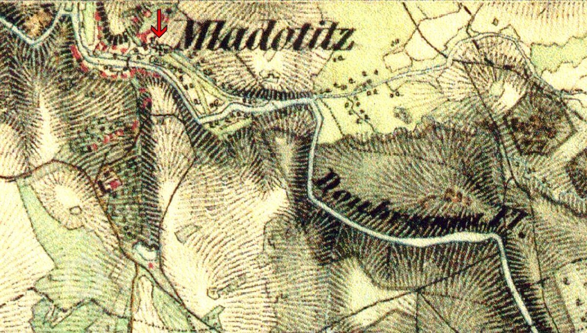 Na úhledném pahorku, nade mlýnem Mladotickým se vypínajícím, stála bezpochyby nějaká tvrz. Jest to ostroh otočený Doubravkou, dosti příkrý, a s druhé strany jest mělká prohlubenina, snad bývalý příkop, který tvrziště odděloval od roviny."