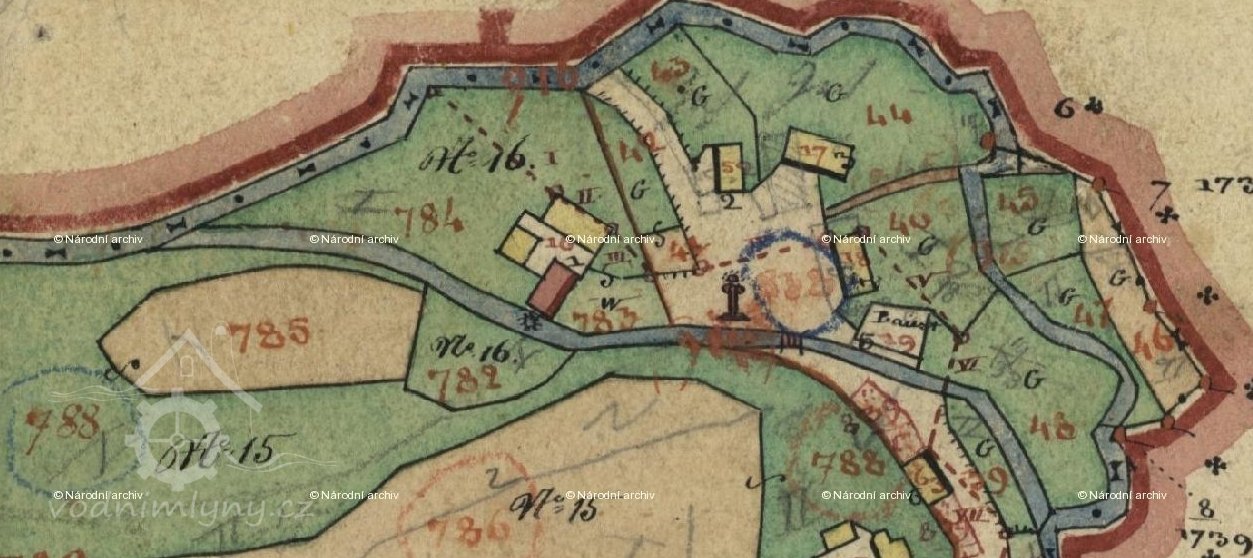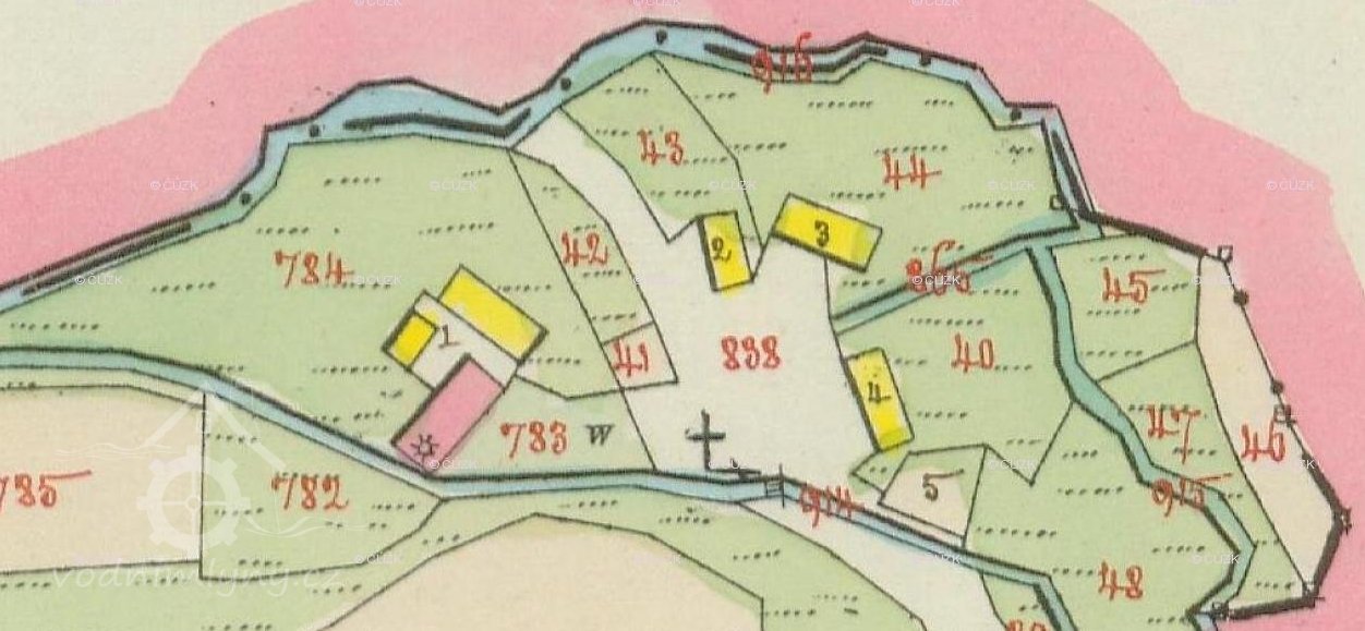 Při potoce stojí mlýn č. p. 16. V čele domu mezi čtyřmi okny jsou zazděny tři tabulky kamenné. Na první mezi prvním a druhým oknem v levo je nápis: Proprio Filio suo non pepercit Deus, sed pro nobis omnibus tradidit. (Svého vlastního syna neušetřil Bůh, ale za všechny nás jej obětoval.)