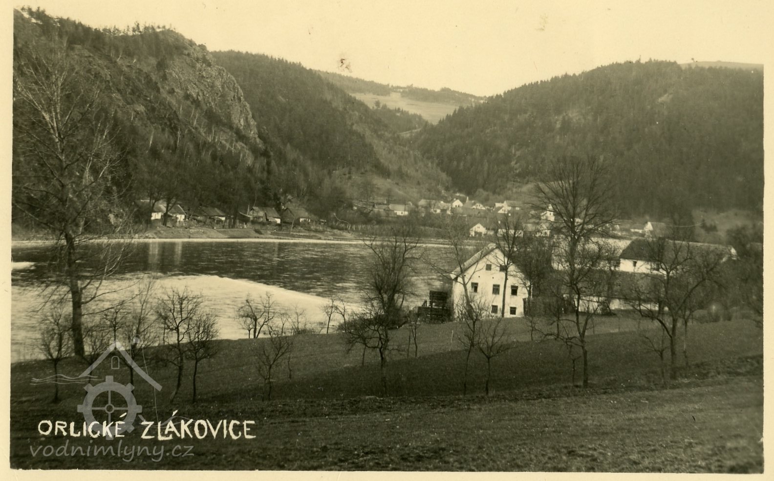 Na pravém břehu, na konci Orlických Zlákovic stál válcový mlýn nazývaný Bláhov či Na Bláhově. Mlýn byl v těchto místech nejméně od 16. století – jeho poslední podoba s vodním kolem ve štítové stěně mlýnice pocházela z roku 1891. Právě v té době stal se tady panem otcem Polák Stanislav Kosciuk, který mlýn zvelebil a zavedl zde elektrický proud.