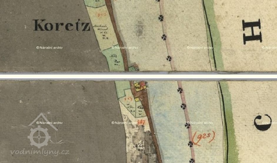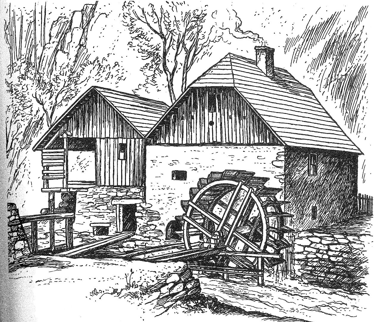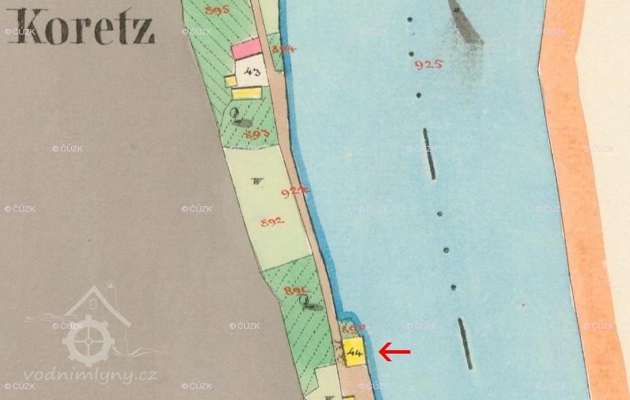 Popis1930: 2 kola na spodní vodu, hltnost 2,5 m3/s, spád 1 m, výkon 10 HP