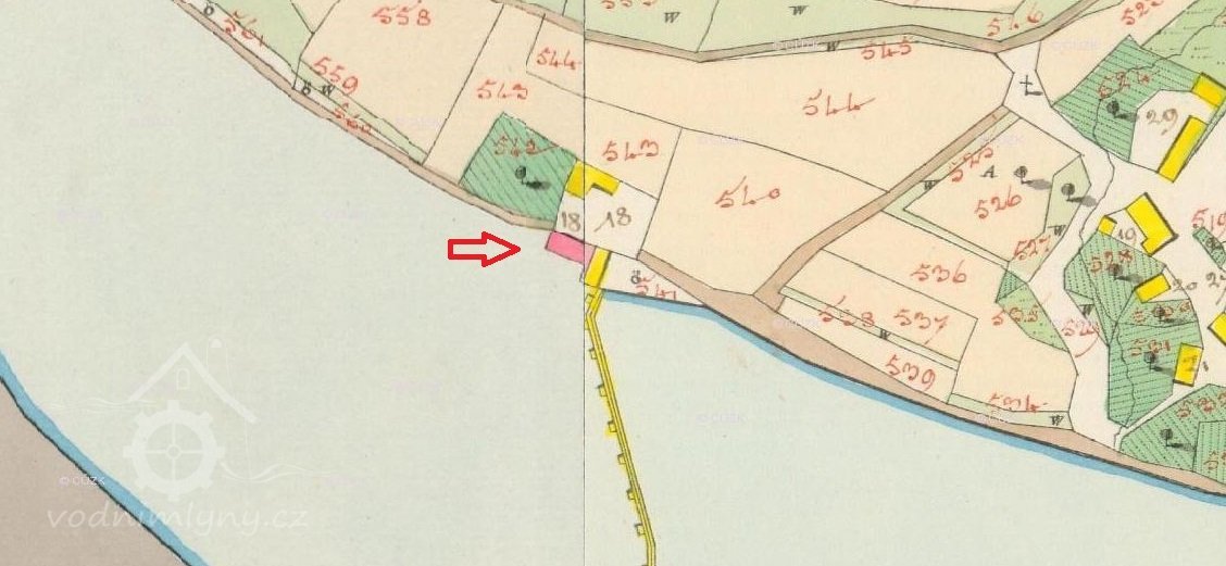 Popis1930: 1 kolo na spodní vodu, hltnost 4,5 m3/s, spád 0,9 m, výkon 16,1 HP