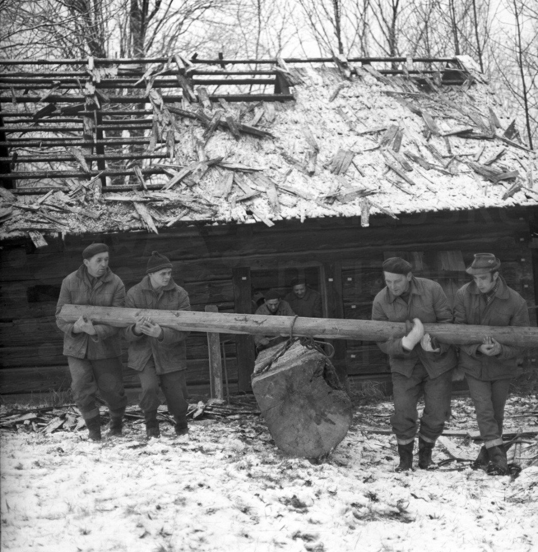 Stavba mlýna na novém místě - stavba krovu, 1979, © www.nmvp.cz/roznov