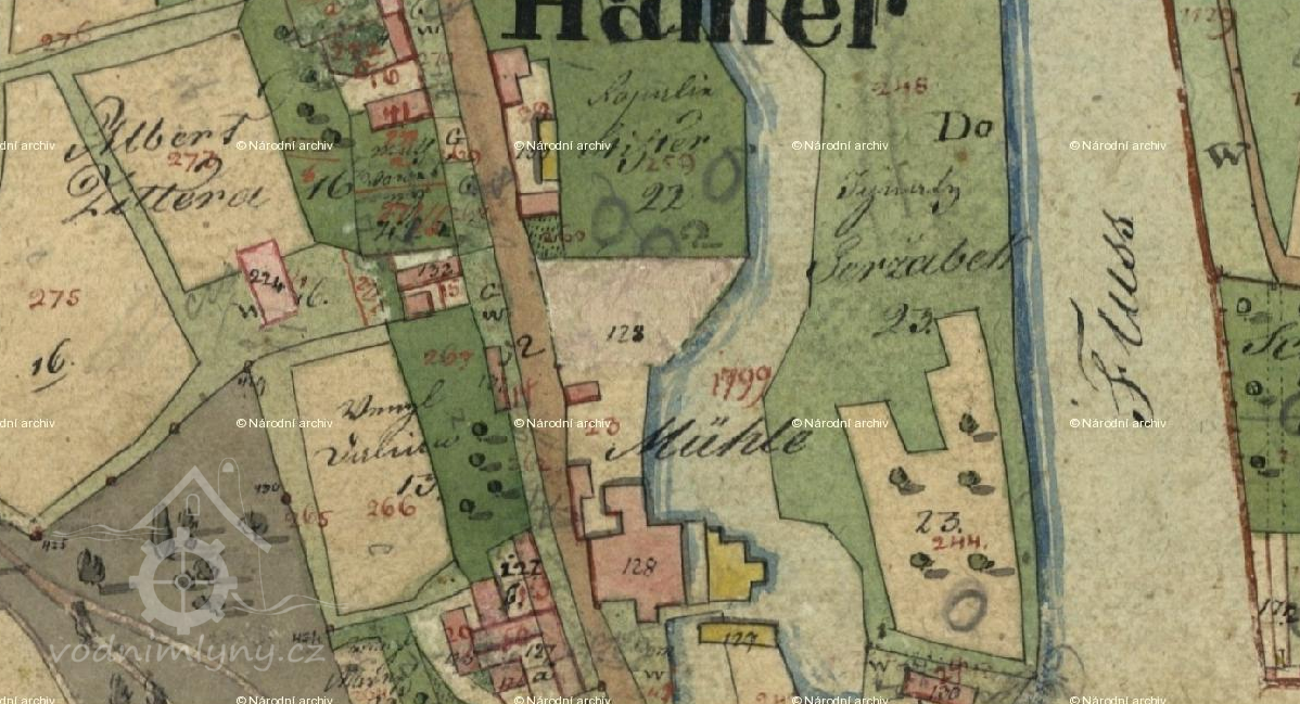 Areál zaniklého mlýna s elektrárnou. Založení mlýna bylo datováno do období po roce 1534. Elektrárna zřízena v roce 1912. Zbourán v roce 1988.Památkově chráněný reliéf s nápisem z budovy mlýna byl sejmut a přemístěn do depozitáře, nyní nenalezen.