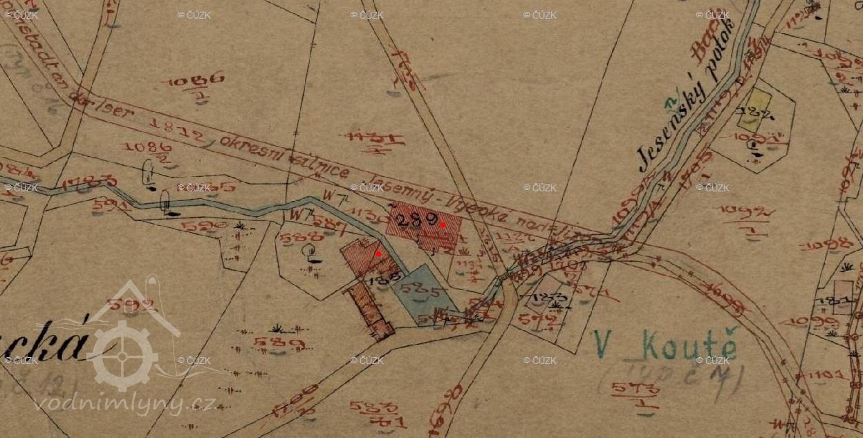 Přestože mlýn stojí geografickou příslušností spíše k Jesenskému potoku, napájen byl vodu potoka Vošmendy z vedlejšího údolí, jak schematicky znázorňuje i mapa I. voj. mapování.