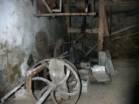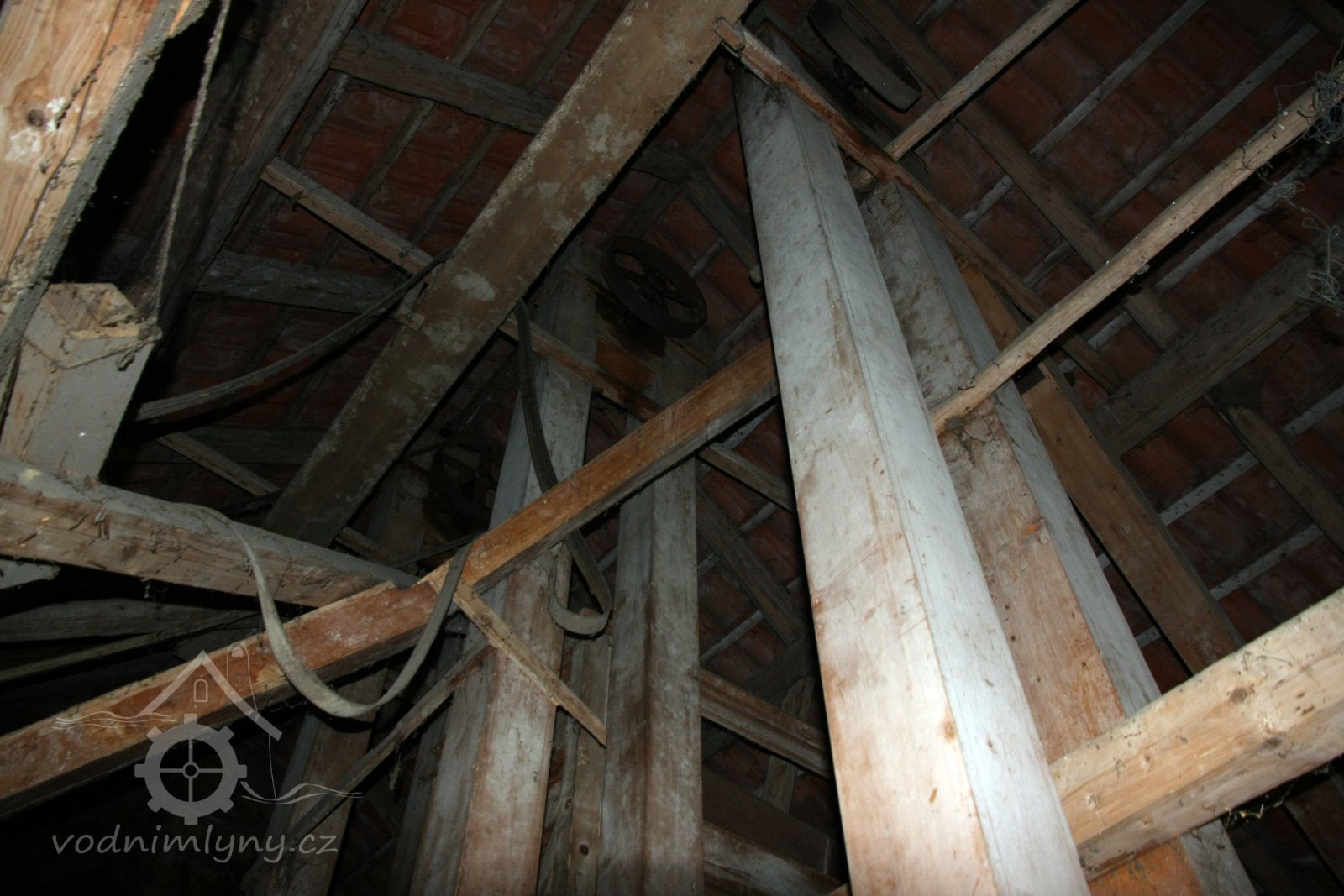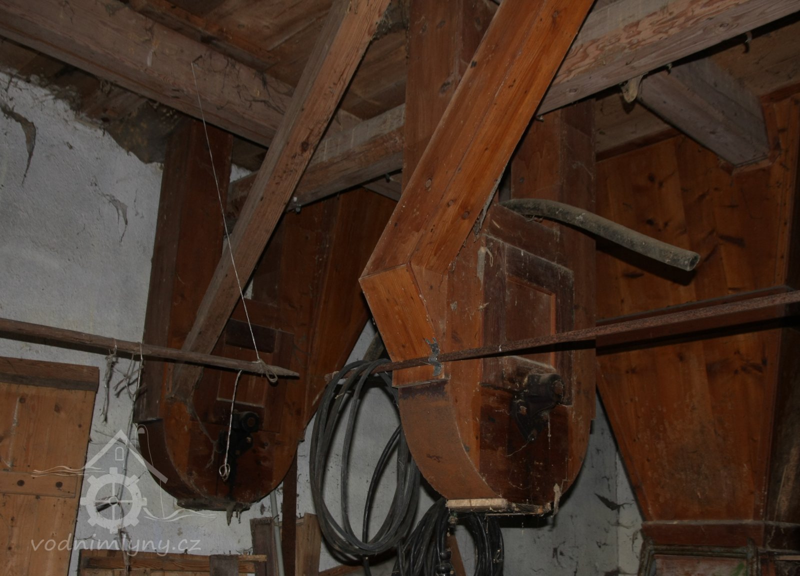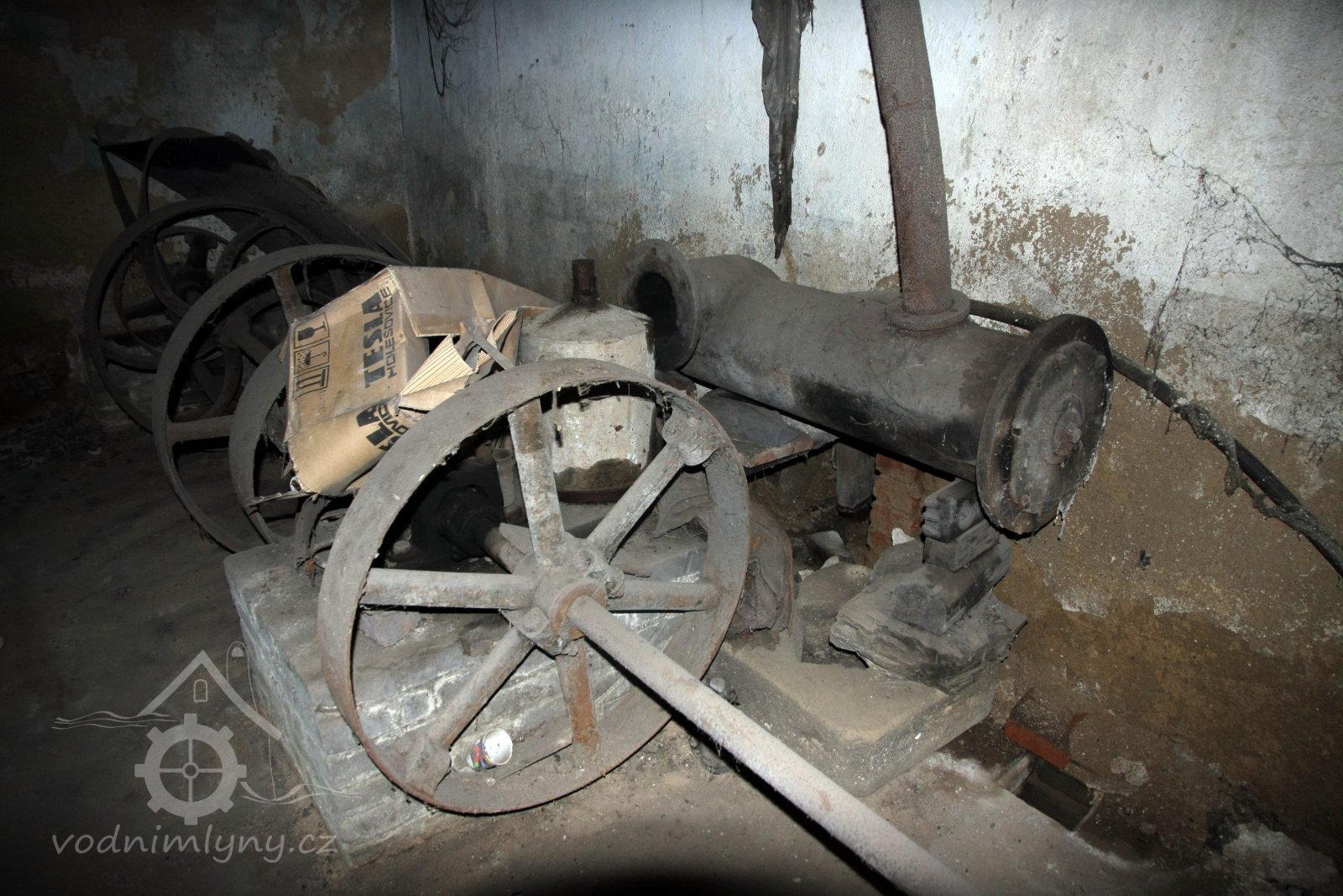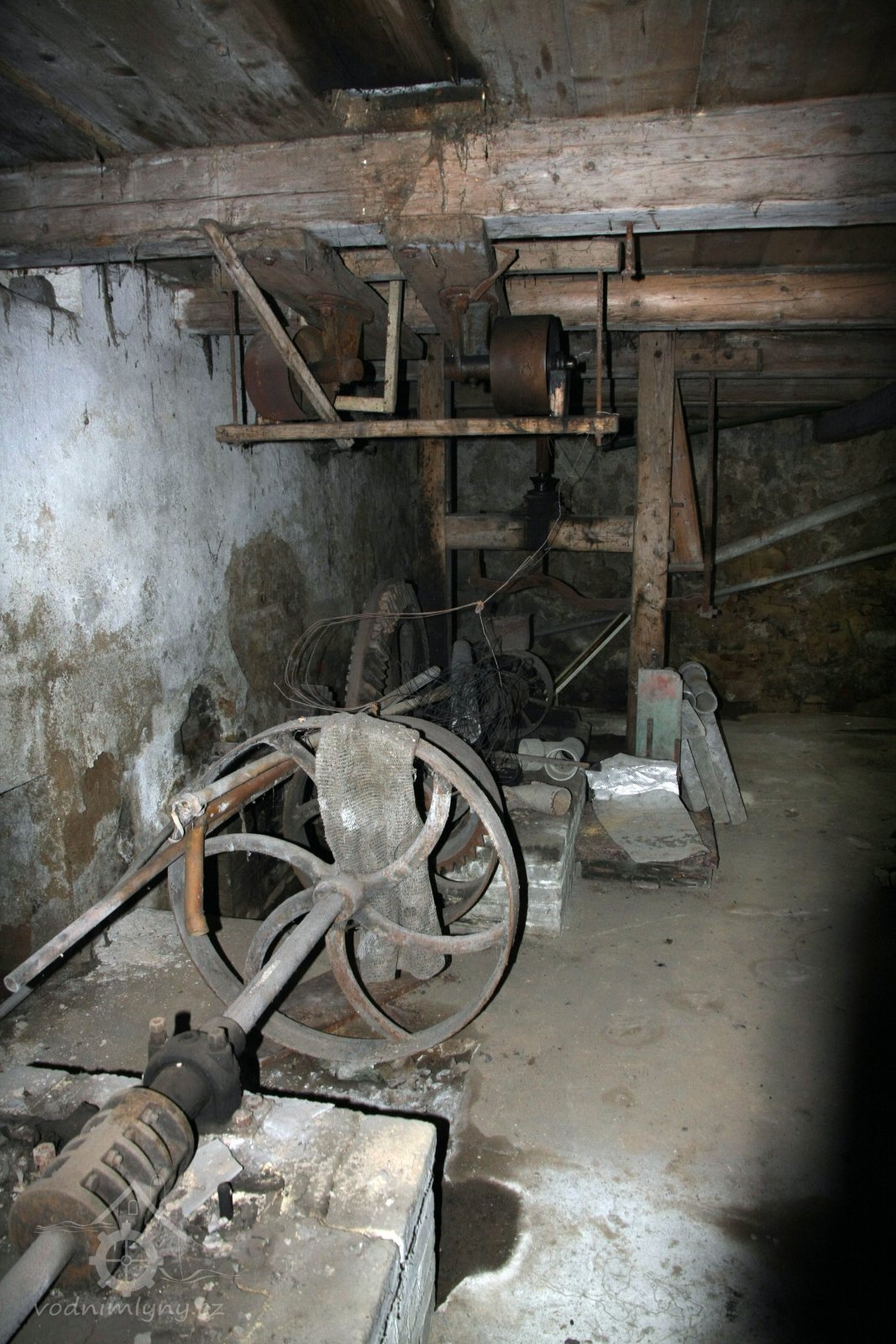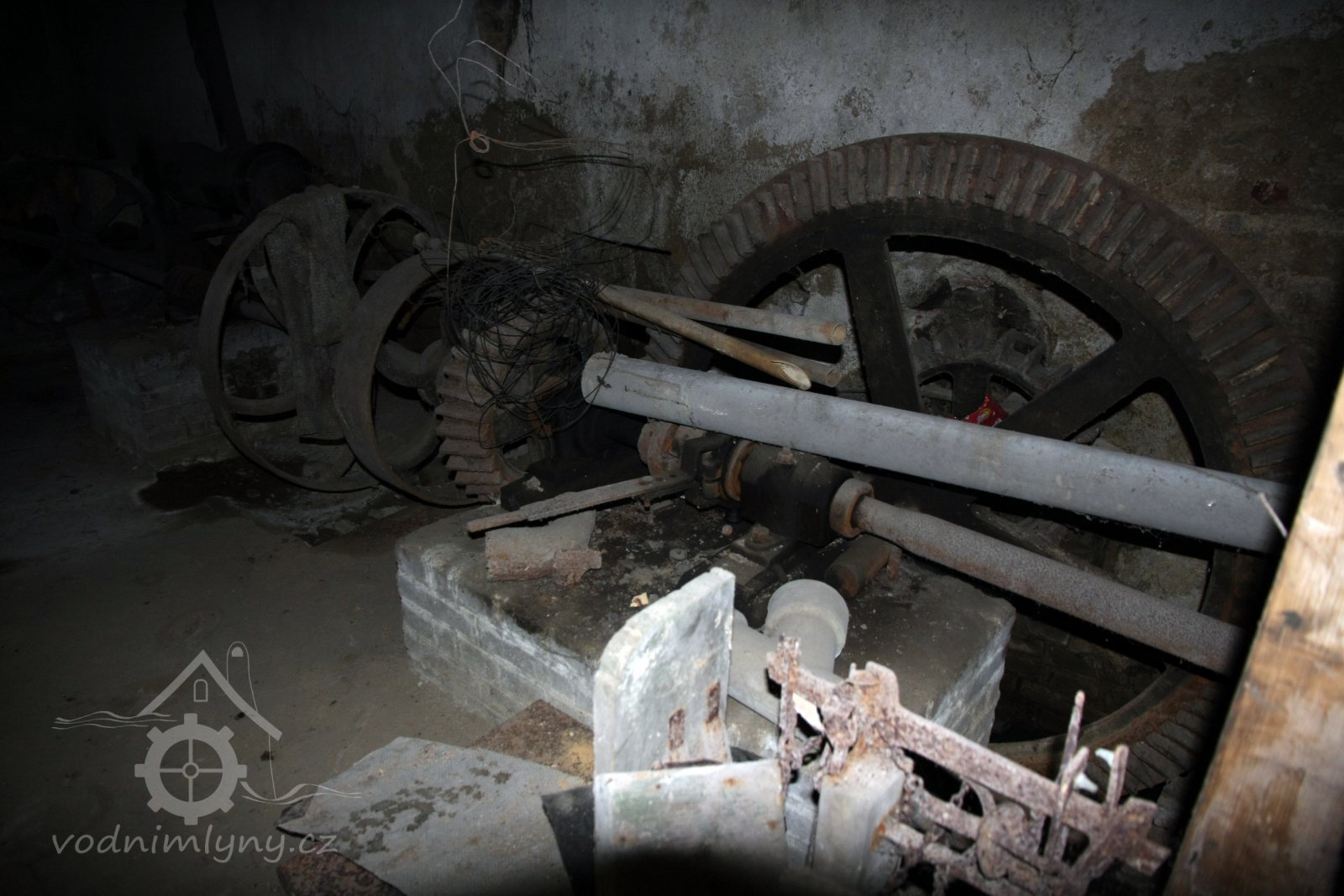 Hlavní transmise s převody na mlecí kámen a lehčení, 2014, © Šimek, (Prvky na obrázku: transmise, řemenice, převody)