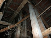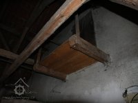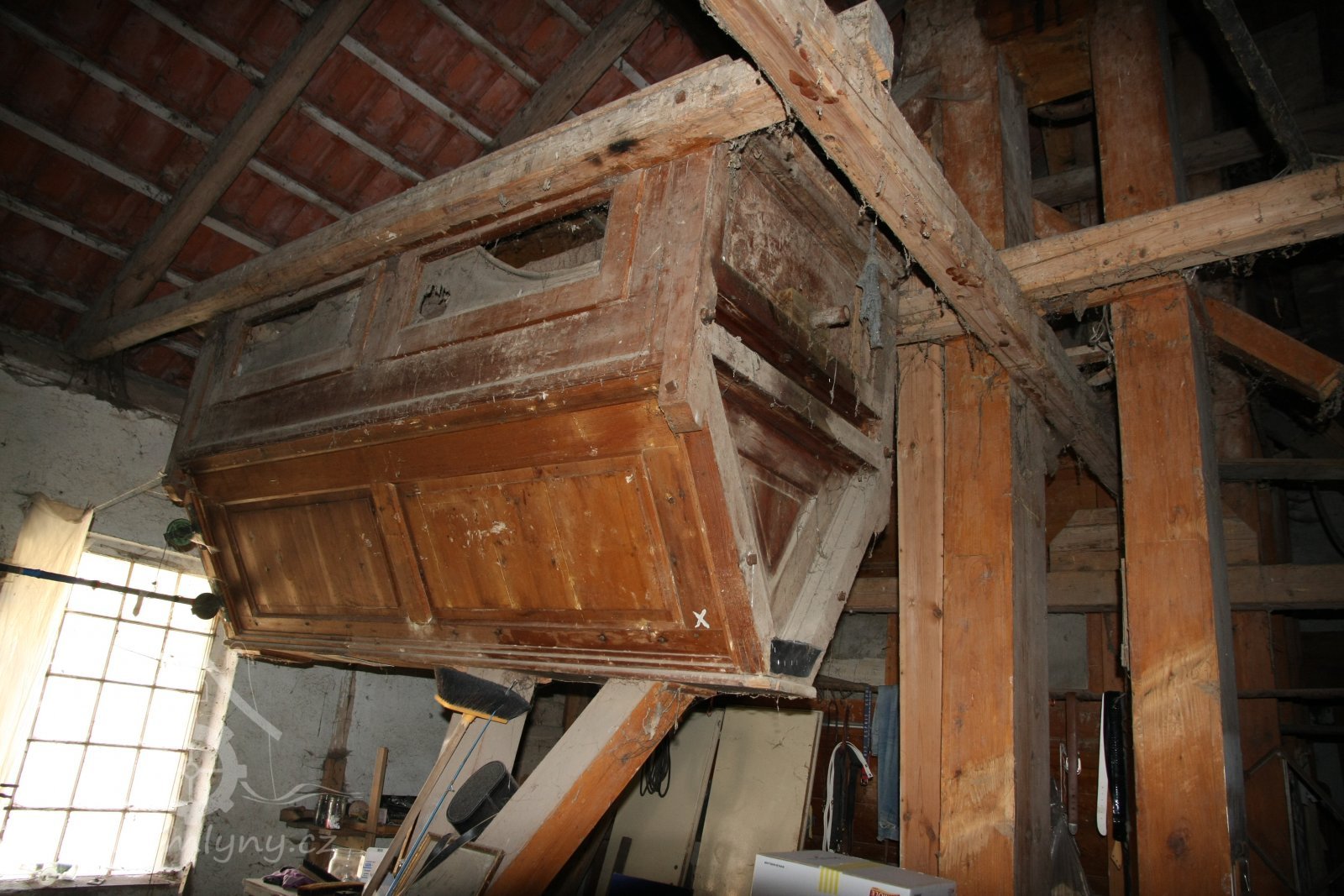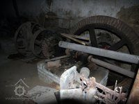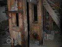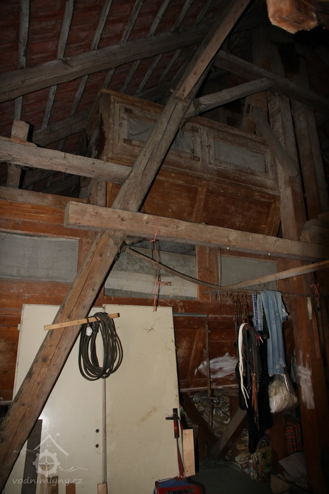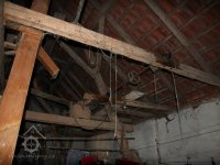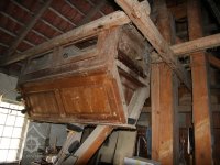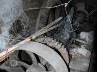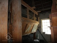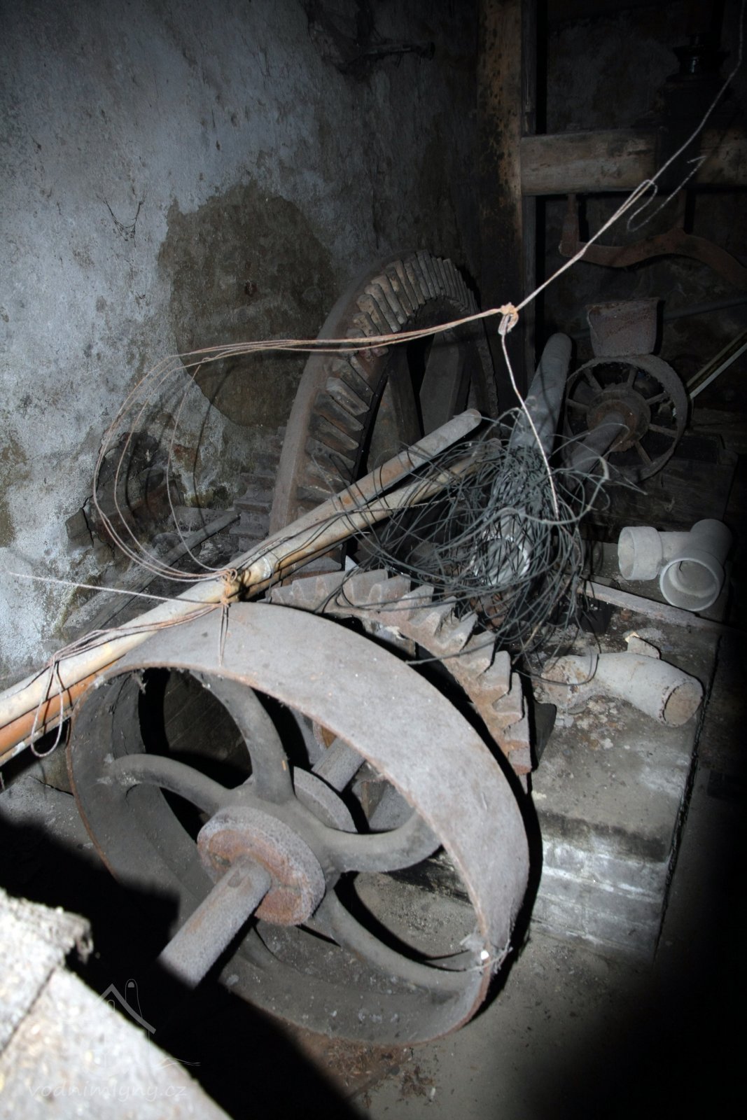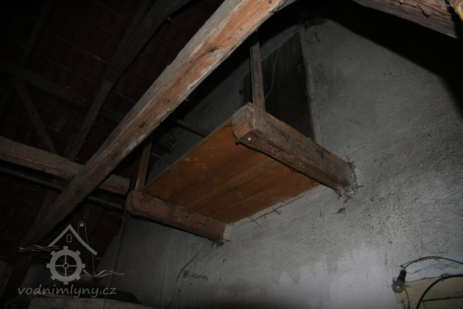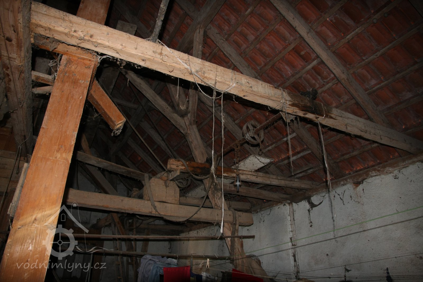 Hlavní transmise s převody na mlecí kámen a lehčení, 2014, © Šimek, (Prvky na obrázku: transmise, řemenice, převody)