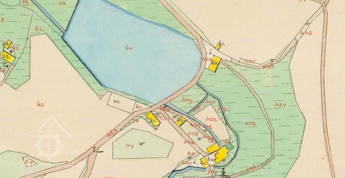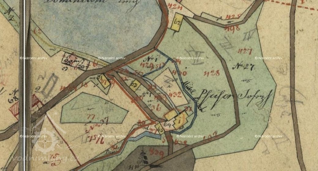 Podle podkladů ke Stabilnímu katastru /1826-1860/ mlýn č.p. 1 na svrchní vodu se dvěma složeními vlastnili Franz a Franziska Pfeiferovi.