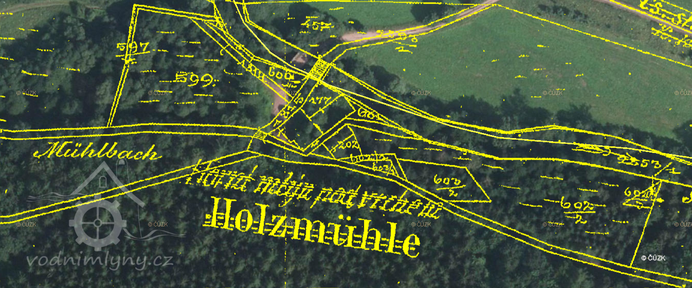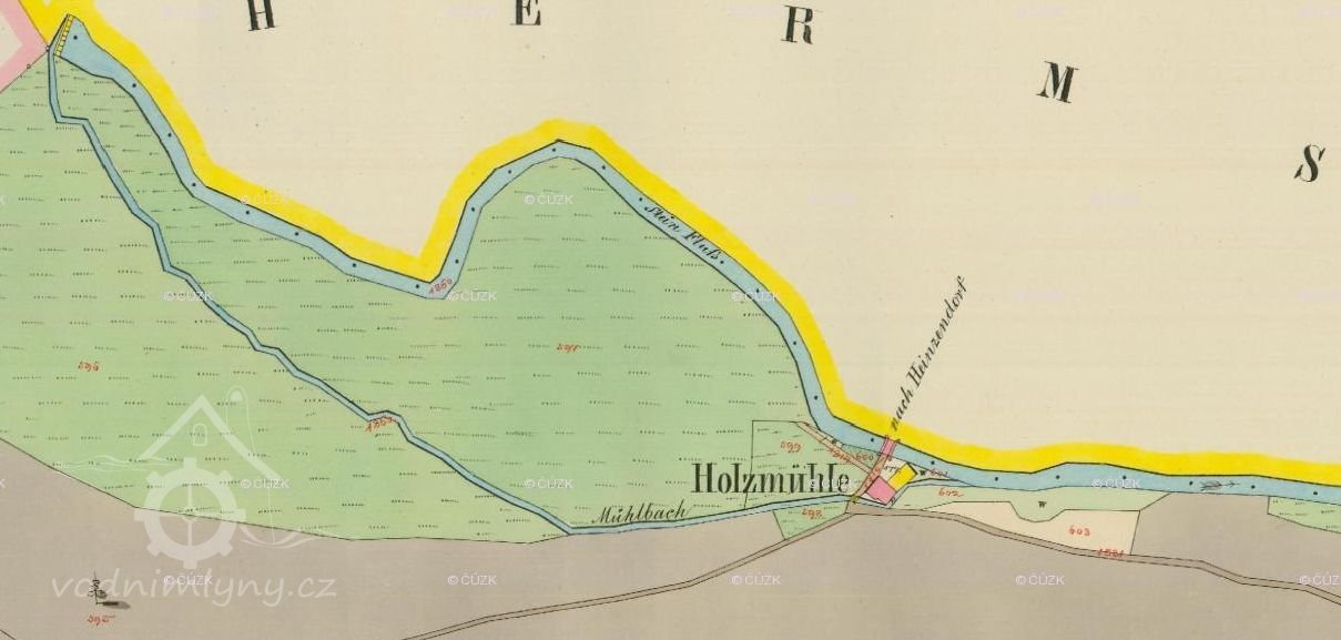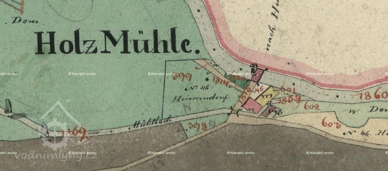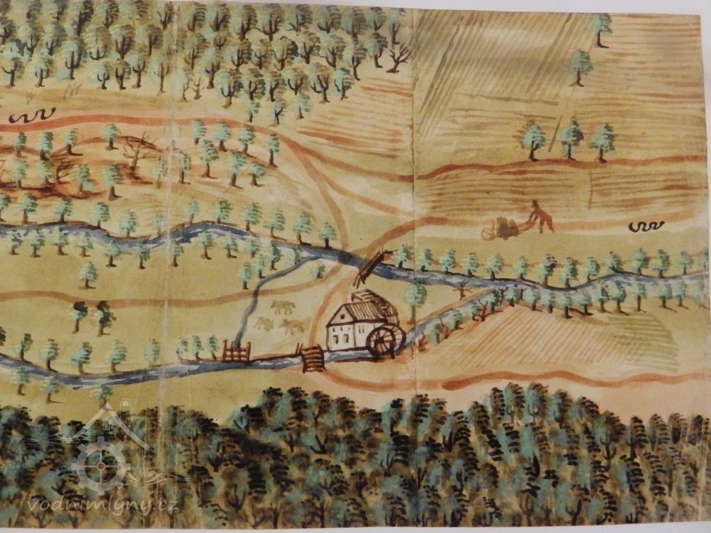 1676 Hesseliův urbář: Tento mlýn stojí trochu dále pod vsí Hynčice u velkého Černého lesa, který náleží až nahoru na hřeben vrchnosti. Taktéž louky mezi velkou řekou a mlýnským náhonem s výjimkou toho, co užívá mlynář. Má dvě mlecí složení a odpradávna se mu říká Dřevěný mlýn. V současnosti je mlynářem Umblauf, poplatky 66 kop ročně odvádí ve dvopu termínech, taktéž výkrmné 6 kop.