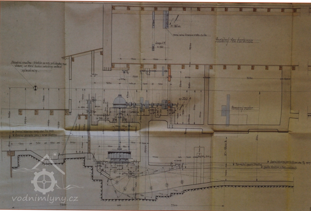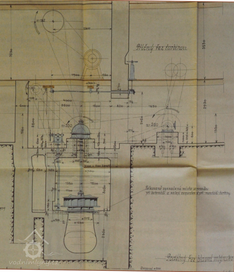 1940: Převod síly turbíny na hlavní transmise byl přímý. Z hlavní turbínové transmise byla hnána transmise v přízemí mlýnské budovy pomocí řemenového převodu a z této transmise byly poháněny stroje na podlaze válcových stolic. Tím mohla být zrušena transmise u stropu 1. patra mlýnské budovy.